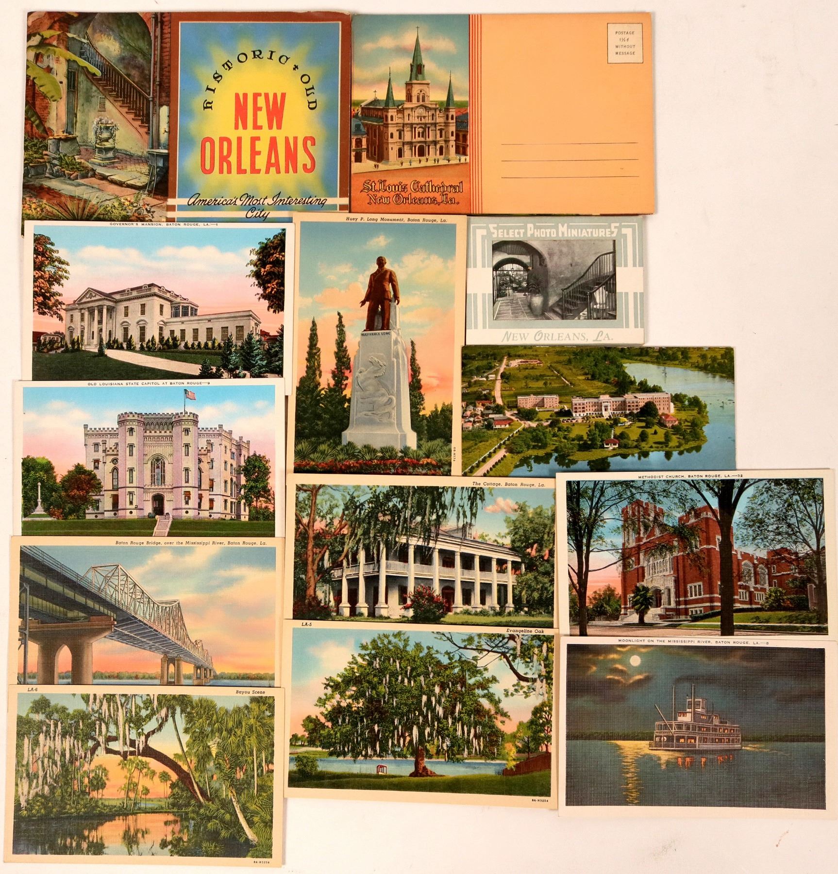 Group includes a set of 9 chromolitho postcards plus photo book titled, "Historic Old New Orleans" and St. Louis Cathedral photo foldout and Select Photo Miniatures pack from New Orleans. Four pieces in all. A cute set of ephemera.