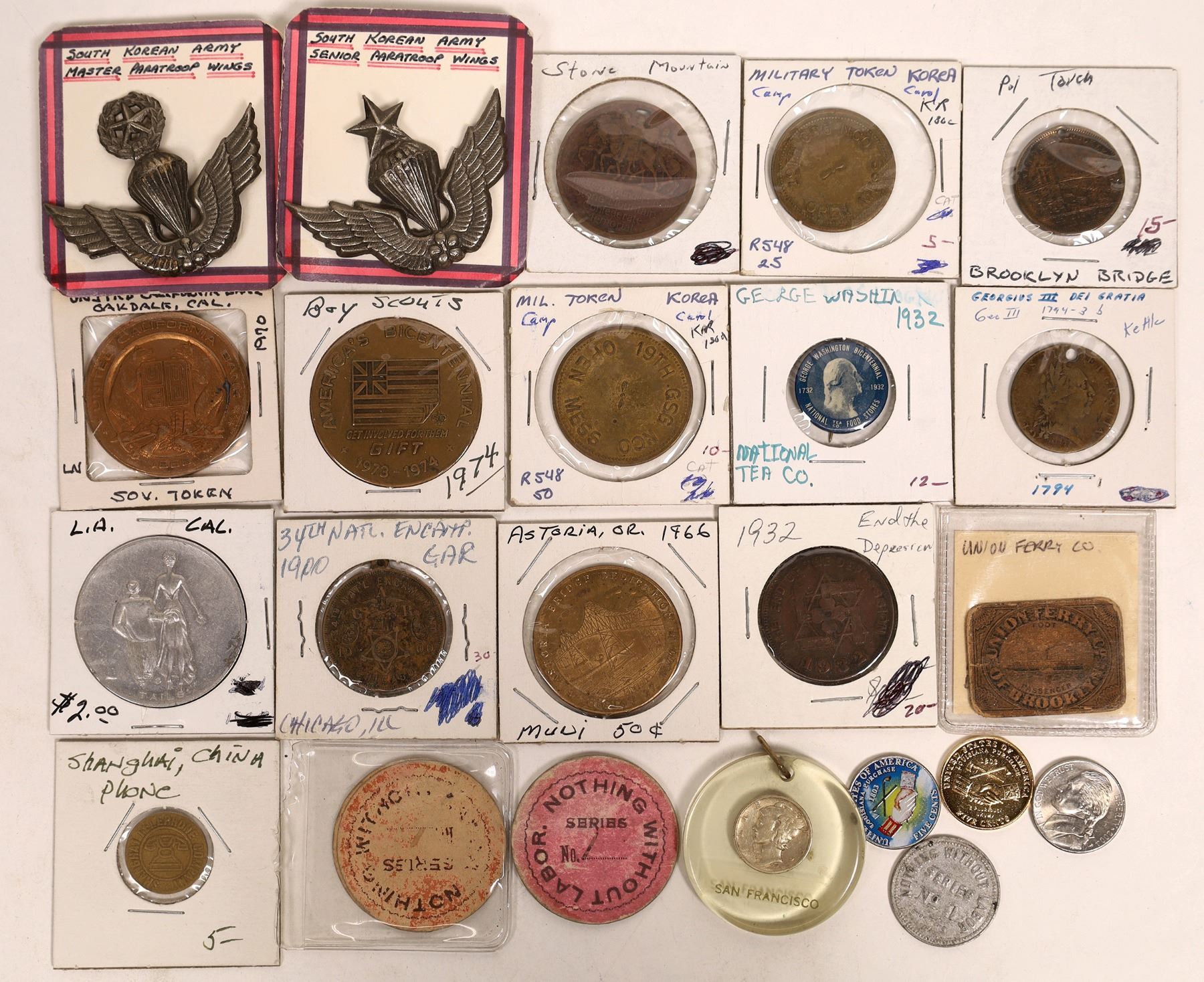 Lot of miscellaneous items: Brooklyn Bridge "the 8th Wonder" medal; Union Ferry Brooklyn Bridge ticket; 1932 "End the Depression" (stop crying, start buying) medal; 1932 George Washington Centtennial lapel pin; lucite encased 1943 Mercury dime; three enameled or plated Jefferson nickels; Shanghai phone token; 1966 Astoria, Oregon bridge opening medallion; "Nothing Without Labor" tokens (3); 1900 GAR encampment medal; 1974 Boy Scouts medal; risque heads/tails token; 1794 George III piece; Stone Mountain bronze medal; 1970 United California Bank,Oakdale, CA;; two Korea military tokens, and two South Korean Army paratroop wings.