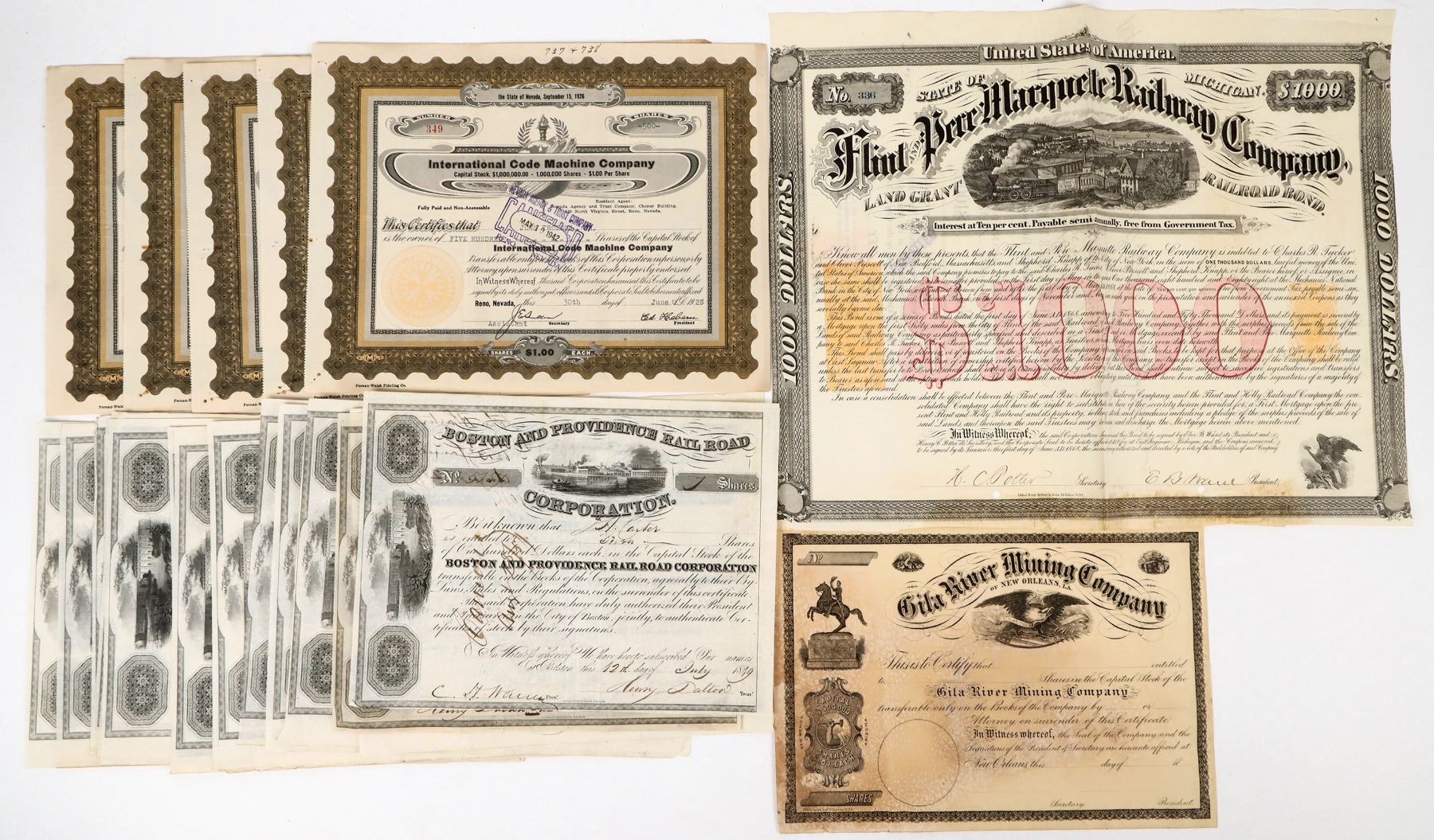 Lot of 27. Includes: Flint Pere Marquette Railway RN bond, 1868; Gila River Mining Co. (c.1859, Arizona); International Code Machine Co. (5, 1928); and Boston & Providence Railroad Corporation (21, 1840s).