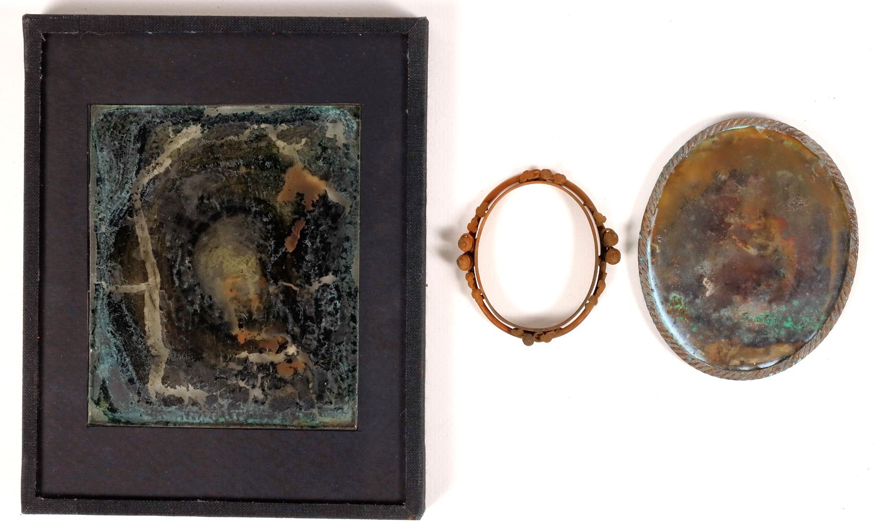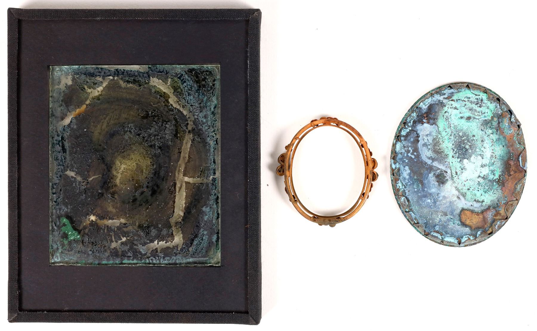 Lot of 3. 1) Daguerreotype oval portrait photo, 2-3/4 in. It has a rope style border, the image is no longer visible. 2) Undetermined subject matter ambrotype. Conserved by Paul Messier in modern frame and glass. Ambrotype about 3x2.75". 3) Oval photo frame, either gold or gold plated. Leaf and ball repeating side attachments on a band. 1.75x1.5".
