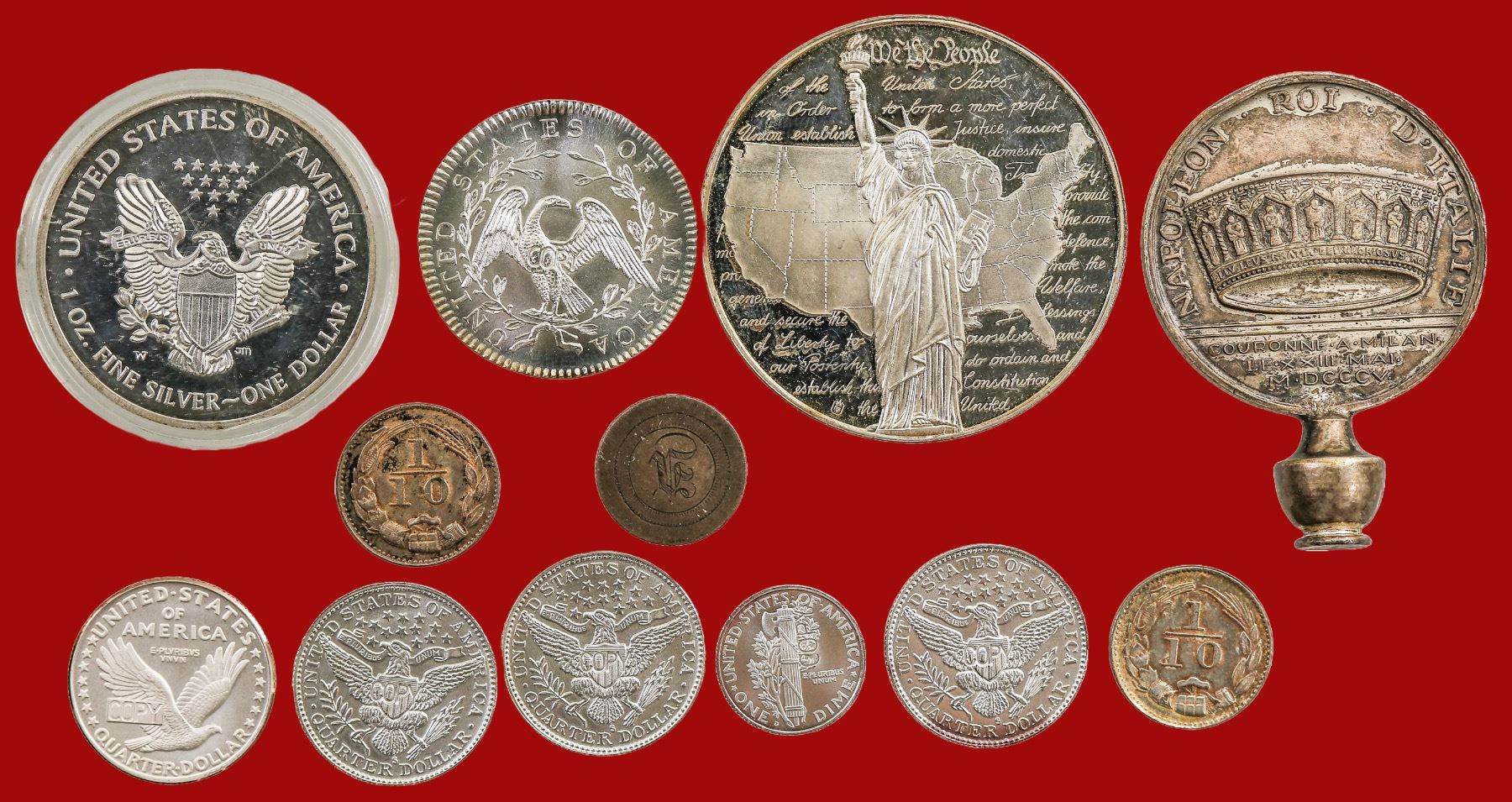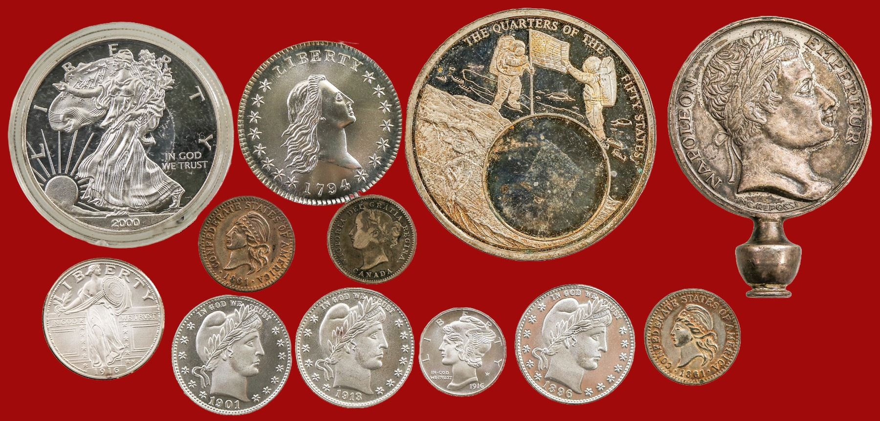 Lot of 12 miscellaneous pieces: 2000 U. S. Silver Eagle dollar; two ounce medallion to hold a state quarter; five Royal Oak Mint replicas: 1916-D Mercury dime; 1916 Standing Liberty quarter; three Barber quarters: 1896-S, 1901-S, 1913-S; two 1861 confederate dime replicas; 1794 half dollar replica; Napoleon medal.