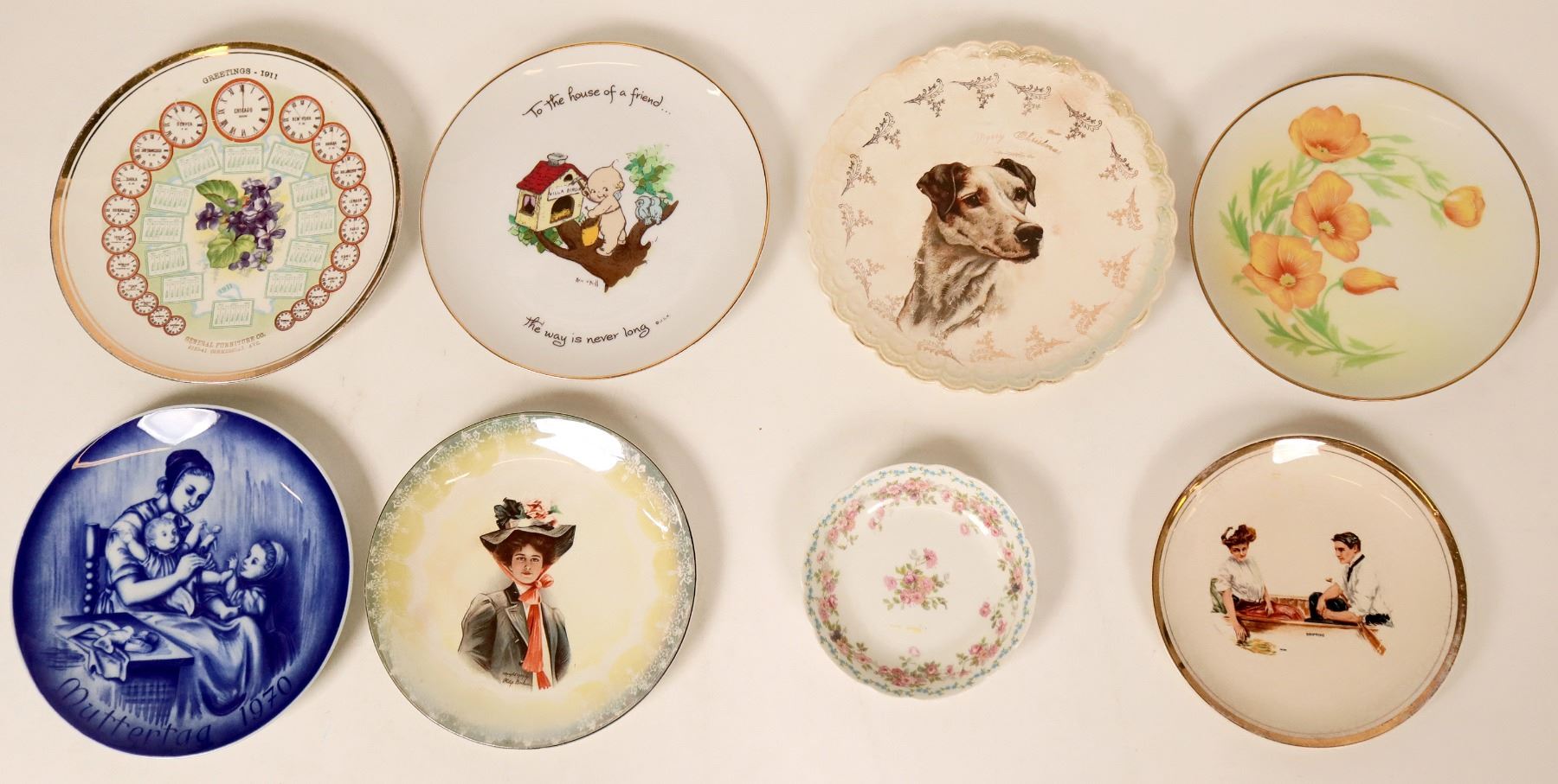 Lot of 8 miscellaneous plates. 1.) Floral dish approx 5" reverse stamps Soa France. CH Field Haviland Limoges Missoula Mercantile Kalispell Mont. 2.) Scene of Mother and 2 children Muttertag 1970 approx 8" reverse stamp Mother's Day 1970 100 Jahre Bareuther Bavaria Germany From the original by Ludwig Richter 1803-1884 Dresden Germany. 3.) "Drifting" scene of a couple in a boat. Approx 6.75" reverse Dresden China Get the Dorla Habit. 4.) Well dressed lady copyright 1907 by Philip Boileaur approx 7.5" reverse Sterling China. 5.) Orange Flowers approx 7.5" Hand Painted Hippon on reverse 6.) 1911 Calendar Plate 8.5" General Furniture Co. 9139-41 Commercial Ave. blank reverse. 7.) Merry Christmas Dog approx 8.5" reverse stamp Sterling china. 8.) To the house of a friend... the way is never long copyright J.L.K reverse stamped Kewpie Collector's Edition produced in Japan for World Wide Arts Inc Cleveland Ohio.