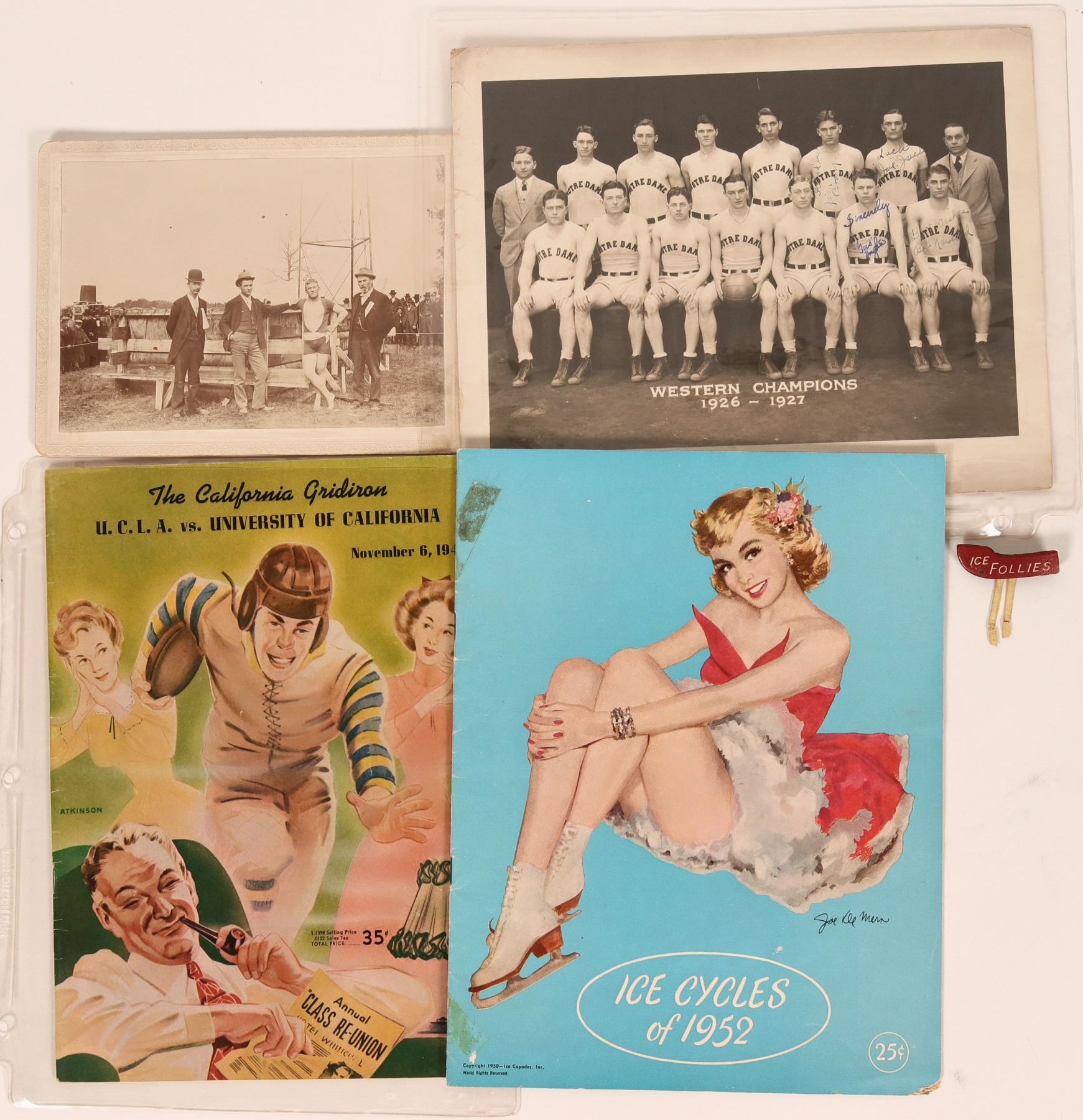 Lot of 5. 1) 8 x 10" photo of Notre Dame basketball players with some signatures. 2) Cabinet card (pre-1900) showing performer at "Jefferson Fair." 3) Ice Follies pin, with label saying SF 1943. 4) Program for The California Gridiron, UCLA vs. Univ. of California, November 6, 1948. 5) Program for the Ice Cycles of 1952.