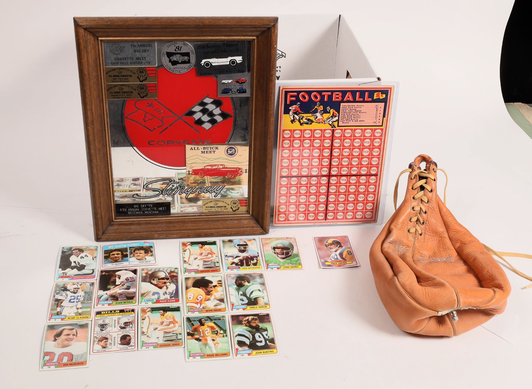 Northwest Annual Corvette Meeting momentos, framed mirror glass (12 x 15 inches), with eight meetings 1979-1990 around the Northwest: Spokane, Bozeman, Missoula, Great Falls, Kalispell. Football punch card by Acme Novelty of Chicago, unused. Football cards from around 1980 (about a dozen). Genuine leather Everlast punching bag (18 inches long).