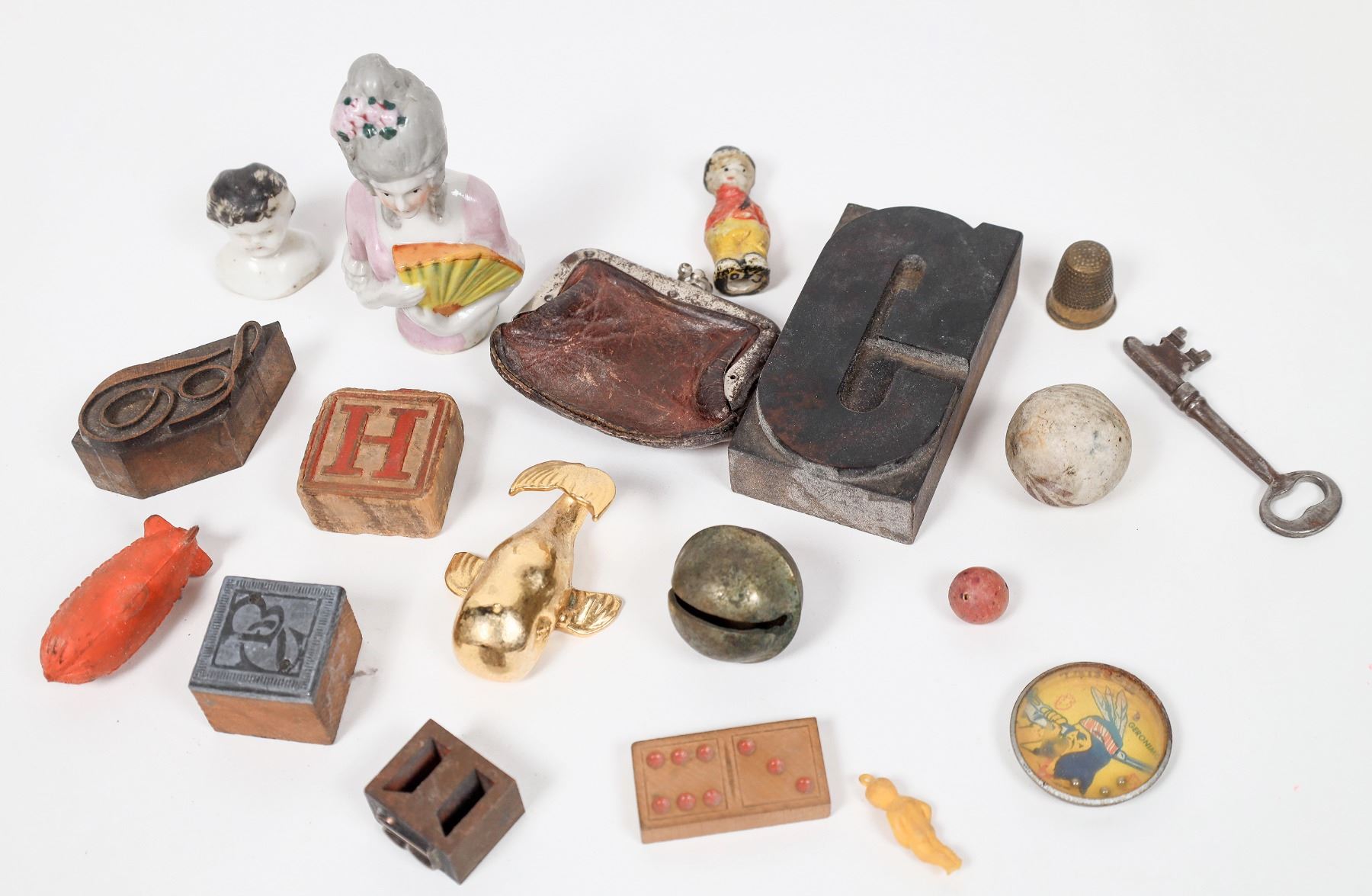 Group of miscellaneous objects including porcelain figurines, small toys, wooden stamp blocks, a coin purse, a domino, a thimble, etc. About 19 items total.