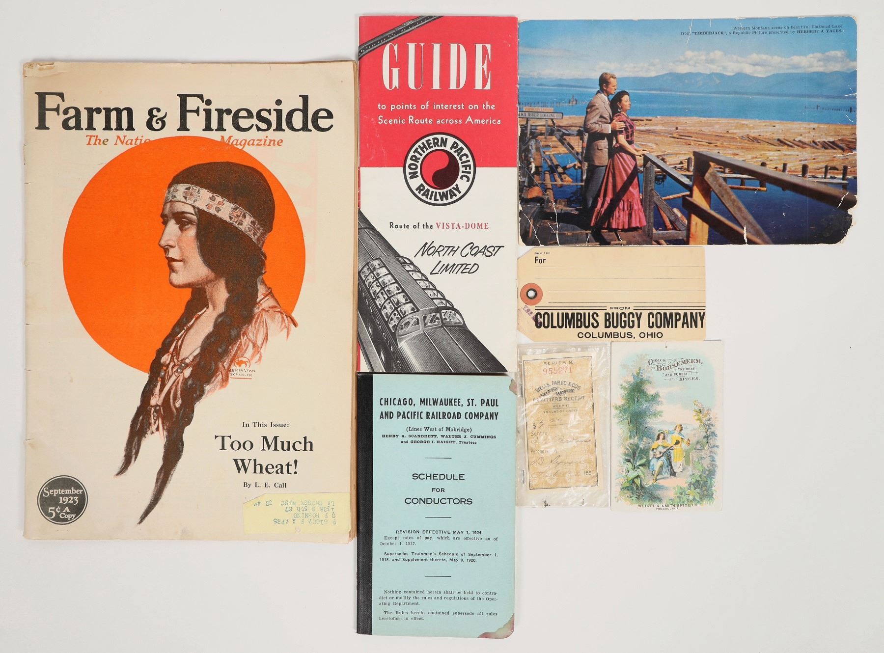Train travel was the way to go in 1923. There are two train schedule books; NP, and SOO lines. A copy of the September issue of Farm and Fireside 1923 to keep you company. There is a RPC of actor Sterling Hayden at Flathead Lake from the movie "Timberjack". Your destination.