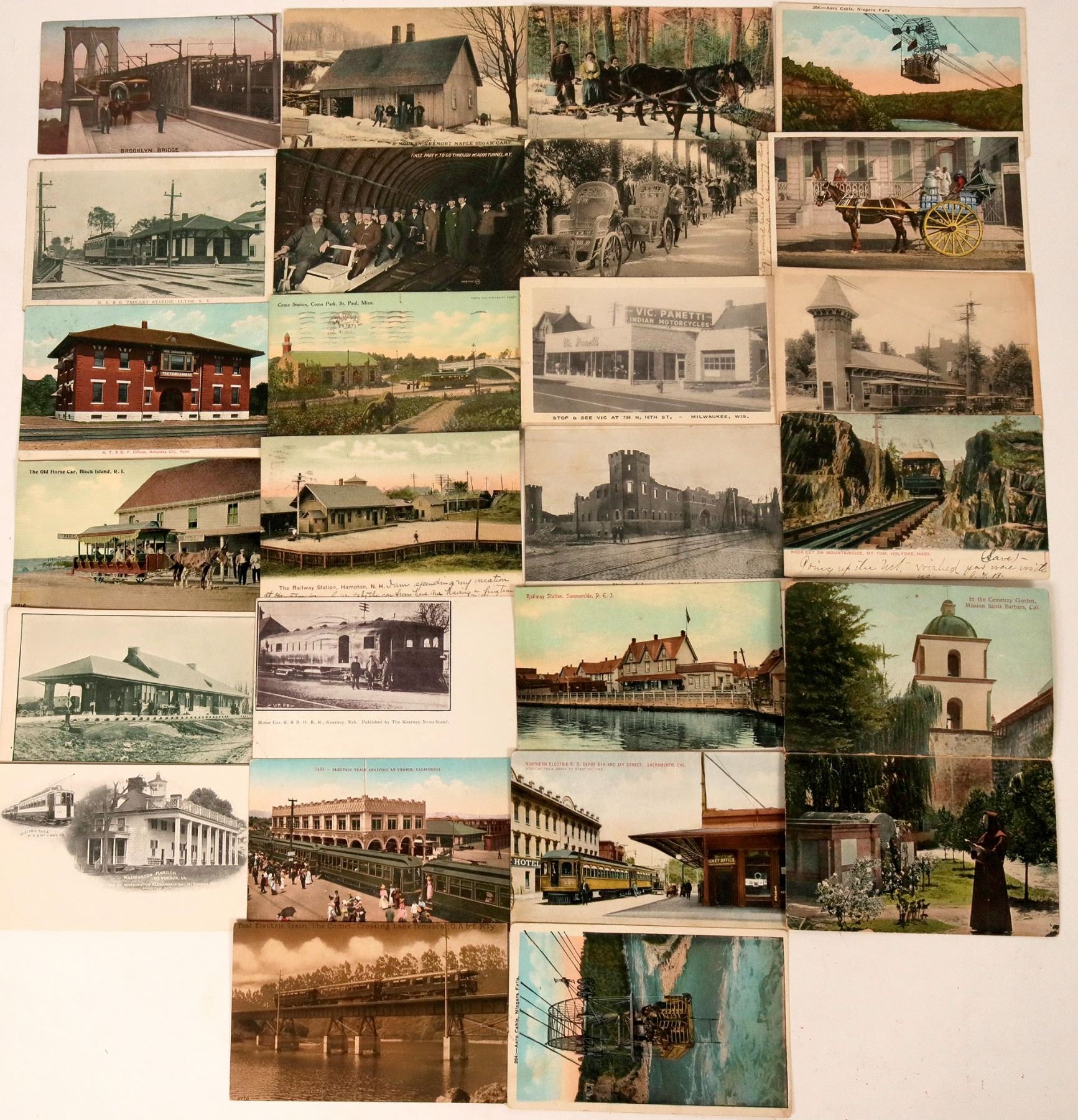 Large lot of postcards from across the United States. Some are colorized and some are black and white. Subject matter includes office buildings, railway cars, stations and depots, electric trains, and people. Three postcards feature electric trains in California, one of which is crossing Lake Temescal in Oakland, CA. One black and white postcard has the Washington Mansion in Mt. Vernon, VA. and an Electric Flyer from W.A. & MT. V. Railway Co. Includes two color postcards featuring the Aero Cable at Niagara Falls. Two nice postcards of note are at a Vermont Maple Sugar Camp .