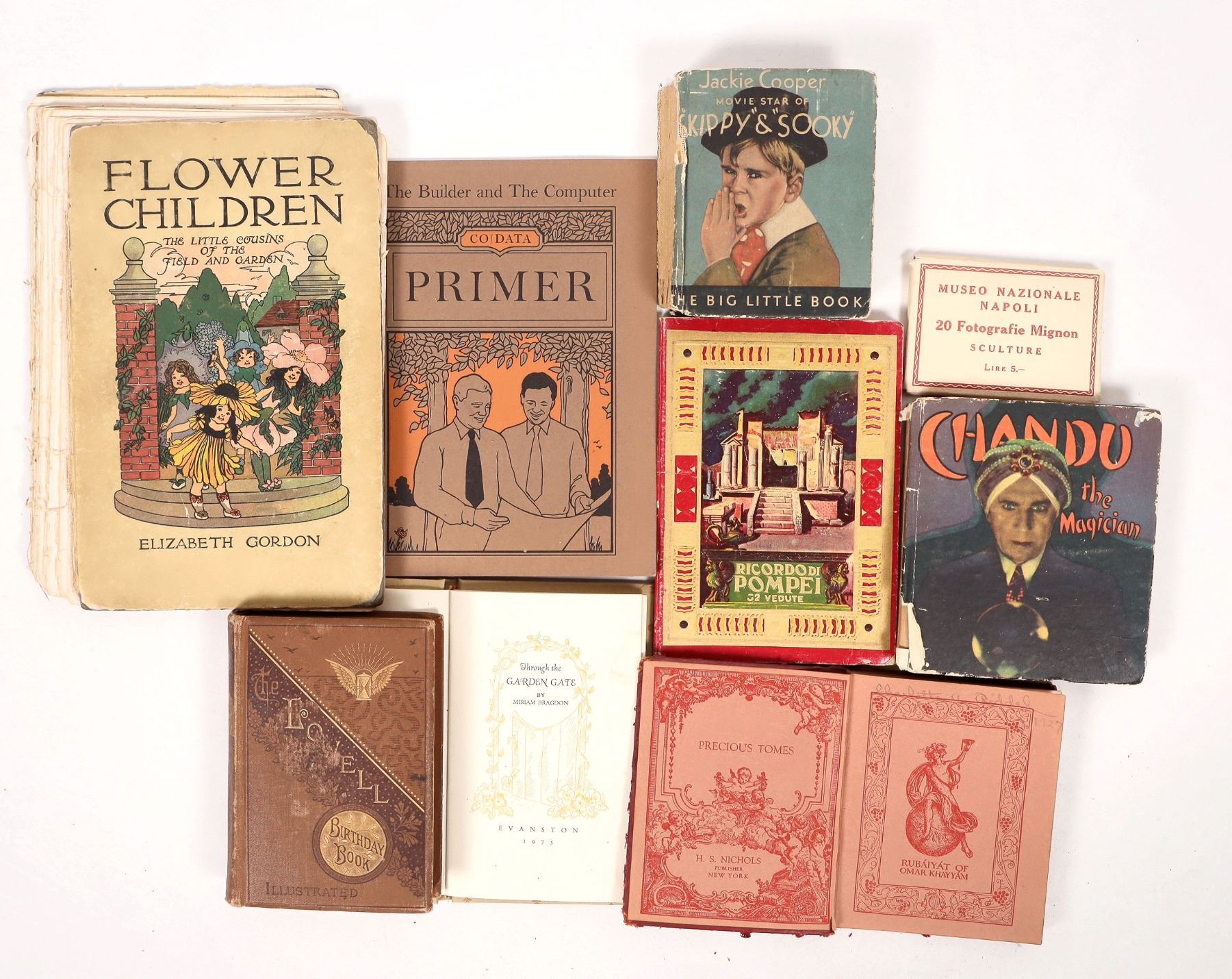 Collection of 8 miscellaneous books, c1883-1975. Includes: "The Lowell Birthday Book," illustrated, 1883, Houghton, Mifflin & Co., famous birthdays and index in back, 402 pp., front board detaching, preface and first two pages detached; "Chandu the Magician," book about the movie, movie stills of Bela Lugosi and other actors, undated but front inscription 1947, spine cover missing, some pages detached, general wear; "Jackie Cooper, Movie Star of 'Skippy' & 'Sooky,'" The Big Little Book, The Story of Jackie Cooper with photographs, 222 pages but missing some pages in back and some detached, front board detaching, spine cover missing; "Precious Tomes," H.S. Nichols, 1924, 141 pp., spine damage, wear; "Through the Garden Gate," Miriam Bragdon, 1975, 36 pp.; etc. Most with damage and wear. Please inspect photos.