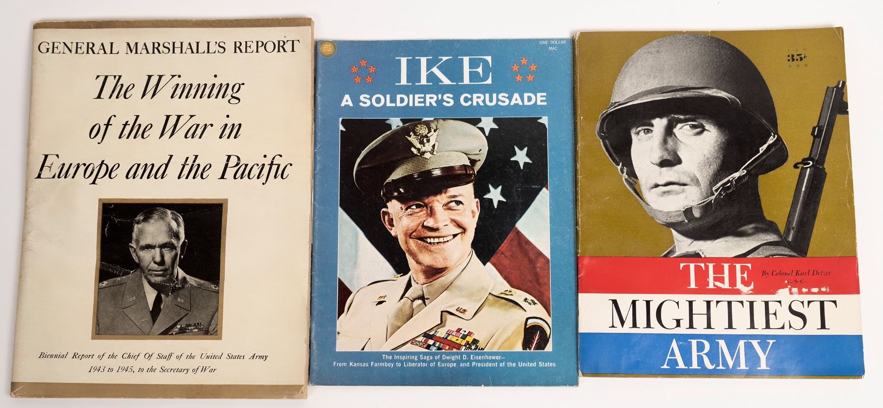 1) "The Winning of the War in Europe & the Pacific, Gen. Marshalls Biennial Report of the Chief of Staff of the U.S. Army, 1943 to 1945, to the Secretary of War ~ Maps (34), Tables (10), Pages (123) ~ (9" x 12" SC) 2) "Ike, A Soldiers Crusade" The inspiring saga of Dwight D. Eisenhower Ò from Kansas farm boy to liberator of Europe & President of the U.S. ~ Copyright 1969 by Universal Publ. & Distributing Corp. ~ (8 O" x 11" SC) 3) "The Mightiest Army", by Colonel Karl Detzer, General Staff Corps, 1945 ~ Tells the reason why and how the U.S. Army became the victor in its battles with the enemy ~ (8 ∫" x 10 Ê" SC, 168 pages)_x000D_