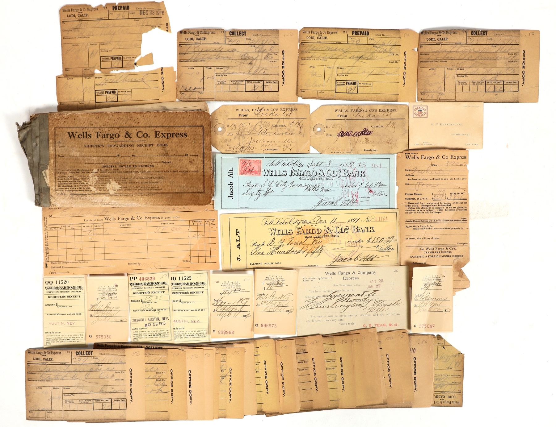 Lot of 20+. Includes: two shipment tags from Yreka, CA, 19th century; two Salt Lake City 1890s checks for Jacob Alt; business card for EP Prendergast, agent for American Express Co.; money order receipts from the 1890s-1910s incl. Austin, Nevada; a stack of receipts from the 1910s Lodi, CA office; a forwarding receipt book with a few pages filled out with CA merchants; and more. Please inspect.