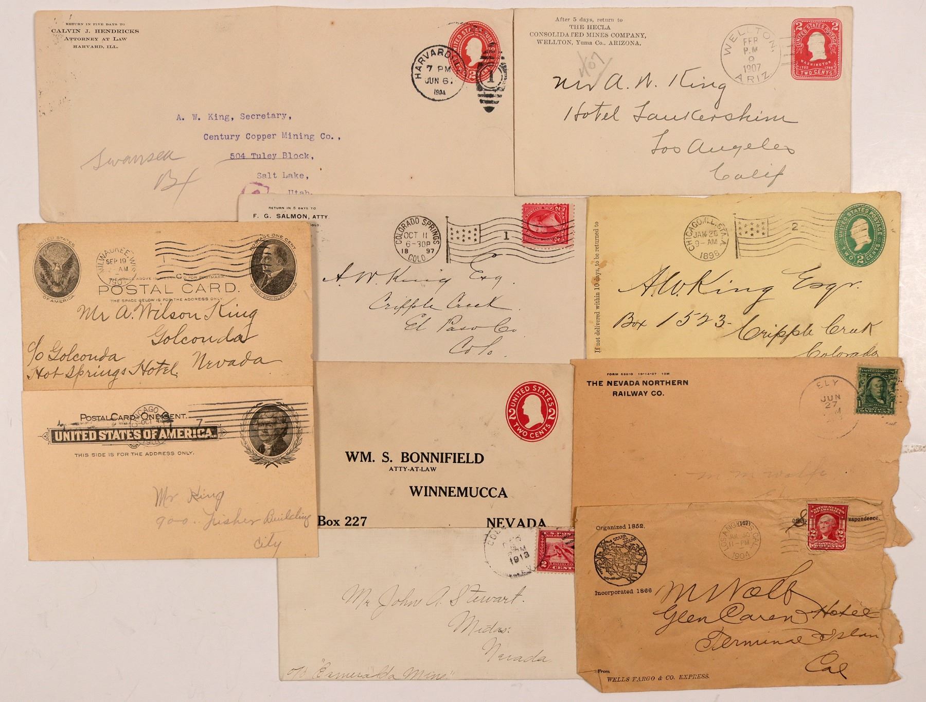 Lot of 10. 1) Corner advertising cover for the Nevada Northern Railway Co., Ely cancel. 2) 1913 cover to John A. Stewart at Midas, Nevada, c/o the Esmeralda Mine. 3) Cover to Wm. S. Bonnifield, attorney in Winnemucca. 4) Six pieces are addressed to AW King, a banker and mining man in Cripple Creek and Nevada: Colorado Springs corner advertising; Hecla Cons. Mines Co. Wellton, AZ corner advertising; etc. Heizer Estate