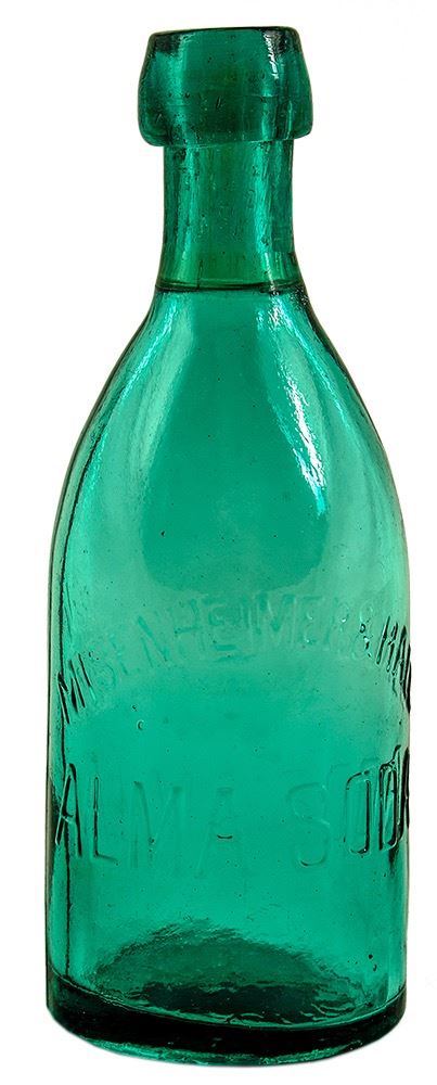 One of the great Western rarities, with Pacific Glassworks embossed on the bottom. The bottle dates to the approximate 1863 period. Blue aqua, with professionally repaired top. There are thought to be only three of these in collections in any condition. Misenheimer had a hotel at Alma Spring on the stage road from San Jose to Santa Cruz. He ran a soda works next to the hotel for only a short period of time. The only other embossed soda bottle with the Pacific Glassworks on the bottom is the W.S. Wright soda from Virginia City, made in December, 1862. Alma today is underwater in the Lexington Reservoir. This is a chance at an exceptionally rare western soda bottle. City: Alma State: California Inventory Number: 39538