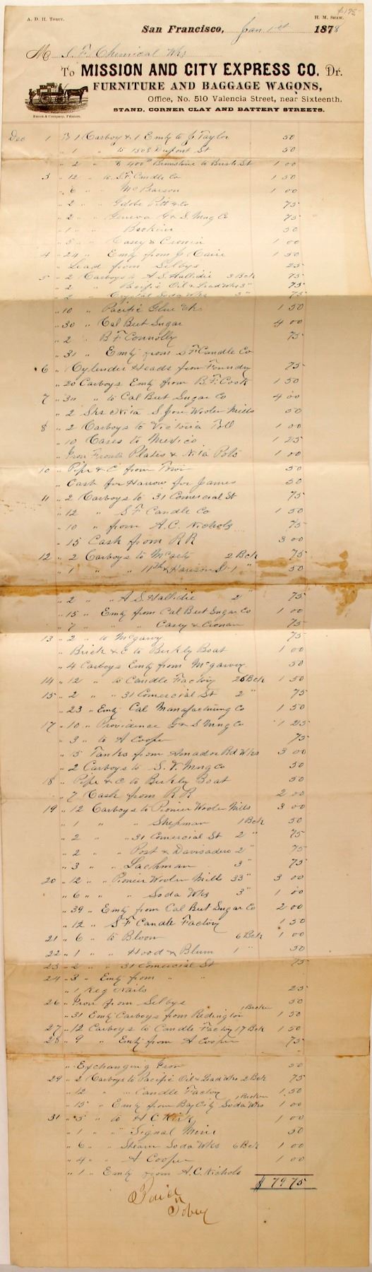 This express company specialized in moving furniture and baggage. The bill is for December of 1878 and is 30 x 8.5". It is so long it had to be taped together (seems original). They moved lead from Selbys, cash from the railroad, Pipe from the Bukley boat, tanks for the Amador Road waterworks. Other companies include the S. F. Candle Company, Geneva G&S Mining Company, Pacific Oil & Lead, Crystal Soda Works, Pioneer Woolen Mills, Signal Mine, Steam Soda, Bay City Soda. Also delivered for individuals. Quite a list! (Potter Collection)