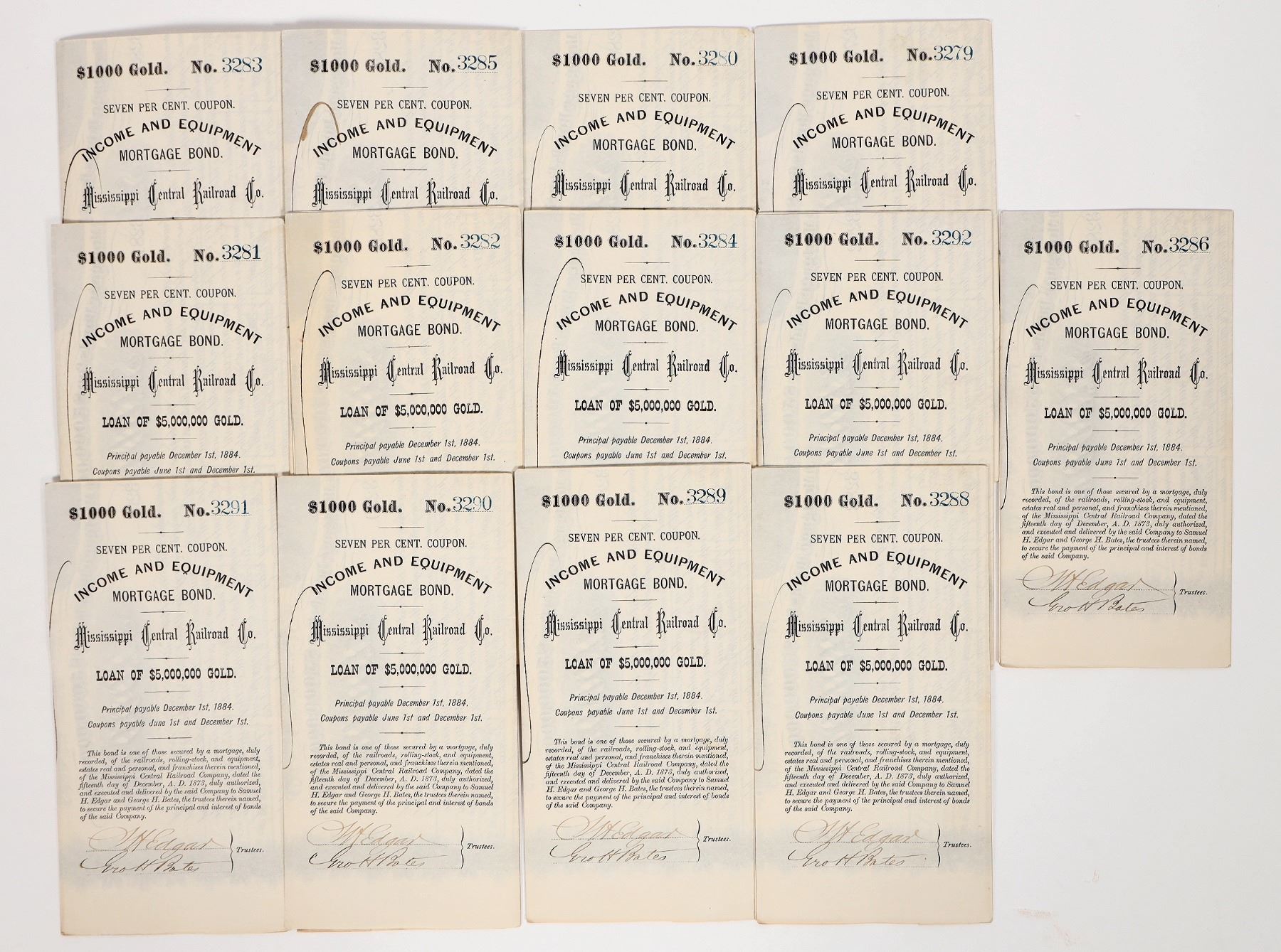 13x 1873 Mississippi Central RR $1000 gold bonds. 2 train vignettes.