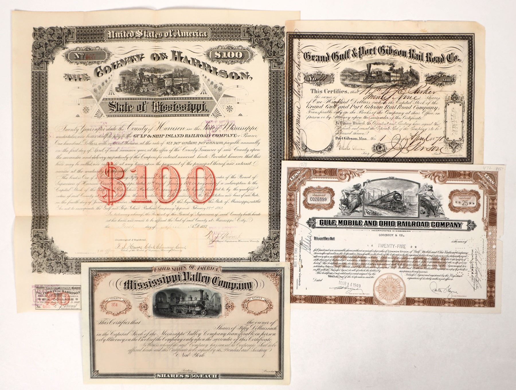 Stocks-1871 Grand Gulf & Port Gibson RR-bottom tear and chips, unissued Mississippi Valley, 1949 Gulf, Mobile and Ohio. Bond-1887 Gulf & Ship Island.