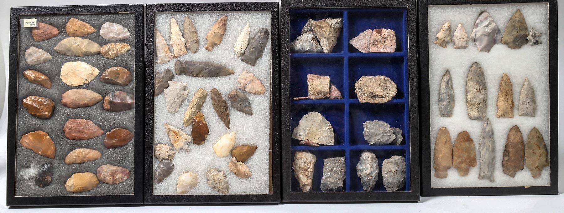 This lot contains seven Riker boxes of projectile points, about 130 points in all. Chert, in gray, pink, butterscotch, and white in color, some early tools. (1.5 in/ 40mm to 4.5 in./114 mm). Est. 18,000 to 8,000 B.P. From the Mississippi Valley to Oklahoma area. Please see photos for details. Certificates of Authenticity may be available for some of the pieces in this lot. Provenance: Gary Bracken Collection
