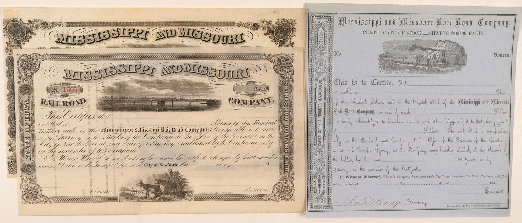 Three different stock certificates. Two BLACK both: common stock @ $100 par. w/vignette of train over six span bridge. #609,I/C, bottom vignette two Indians on horses, revenue stamp, Wellstood, Hay & Whiting printers. #1505, U/U. w/vignette two cows bottom, Henry Seibert & Bros. printer. U/U, on BLACK on blue paper common stock no par listed, vignette of cab less train l-r, signed by secretary, Langdon & Rounds printers. Ken Prag Collection