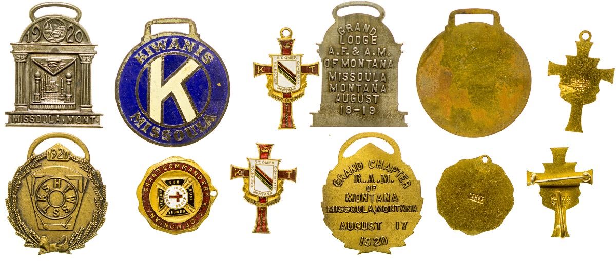 Fraternal collection. Six Fraternal Fobs. Kiwanis Club, Grand Lodge A F &A M, Grand Chapter R A M, Grand Commander K T, 2 K. T. No. 9 of Montana, 1 in pin back. (Svoboda Collection) City: Missoula State: Montana Date: HWAC# 35934