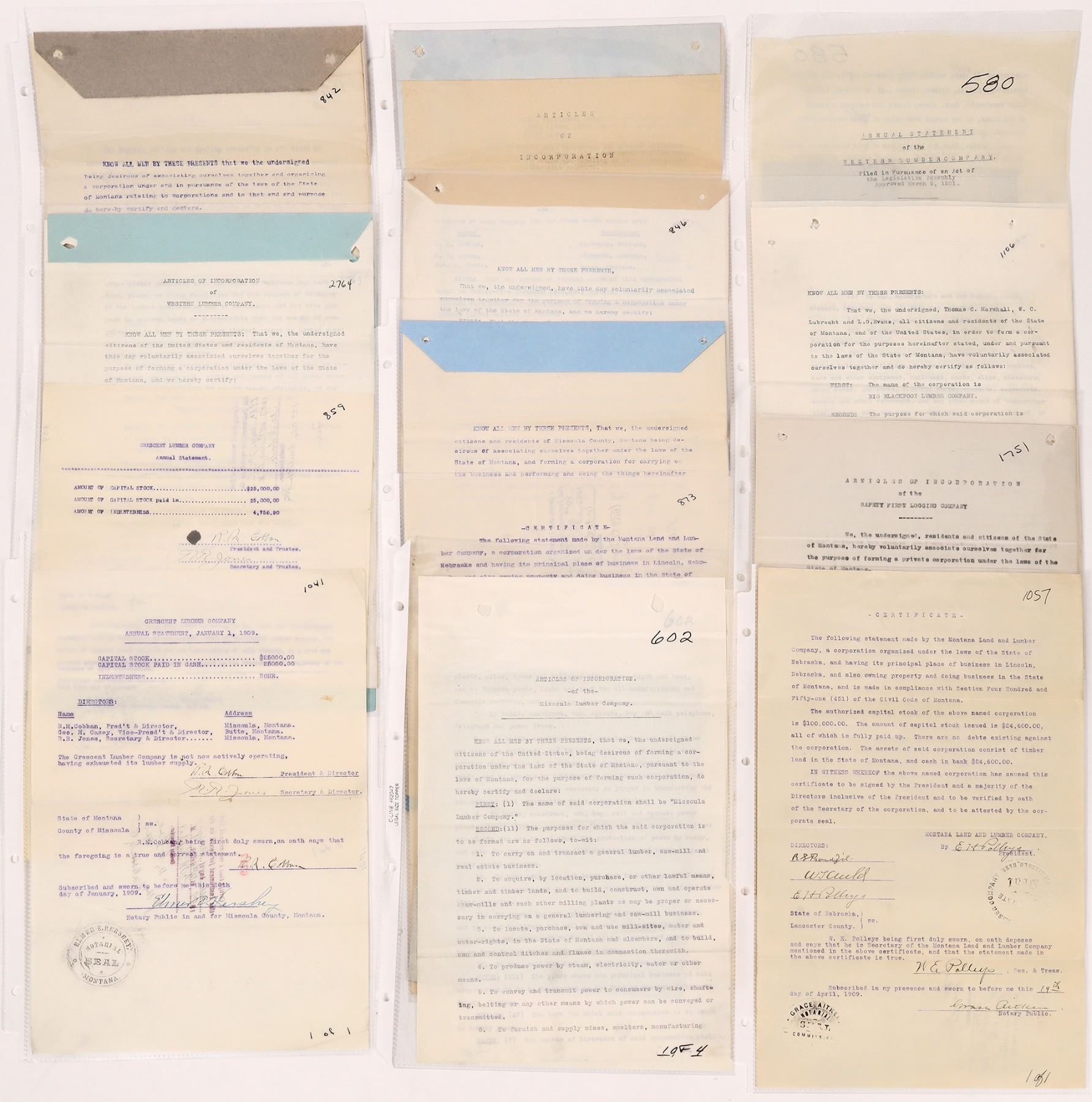 13 mostly Missoula County, Montana lumber company articles of incorporation and legal papers c. 1900-25. Montana Land and Lumber, Safety First Lumber, Big Blackfoot Lumber, Western Lumber, Missoula Lumber, Hope Lumber Manufacturing, Crescent Lumber, Montana Logging, Hanratty-Moderie Lumber.