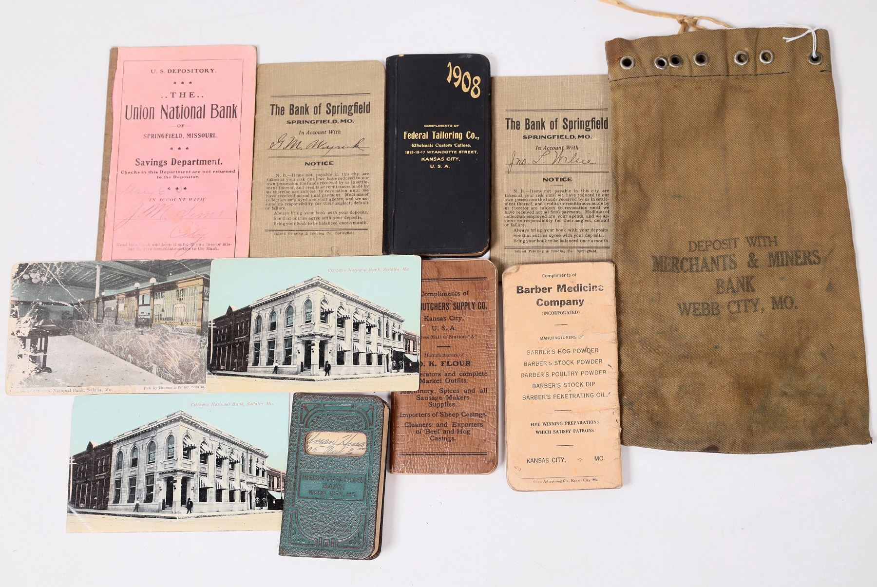 Group of banking items from Missouri. This lot includes a bank bag from Merchants & Miners Bank in Webb City, seven pocketbooks from various banks and other businesses around Missouri, and three postcards from Citizens National Bank in Sedalia. Good condition, some wear.