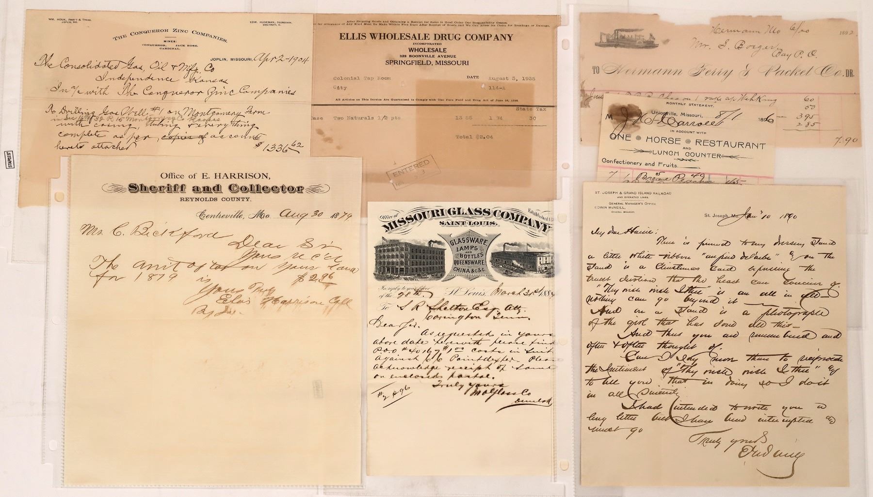 Lot of seven. 1) St. Joseph & Grand Island Railroad. General Manager's Office. 1890. 2) Conqueror Zinc Company. Joplin. 1904. 3) Pictorial Missouri Glass Company. 1884. 4) One Horse Restaurant (now that's unique!). 1896. Unionville. 5) Hermann Ferry & Packet Company. 1892. Hermann. 6) E, Harrison; Sheriff and Collector. 1879. Centreville. 7) Ellis Wholesale Drug. Springfield. 1935. Sold to Colonial Tap Room two naturals???