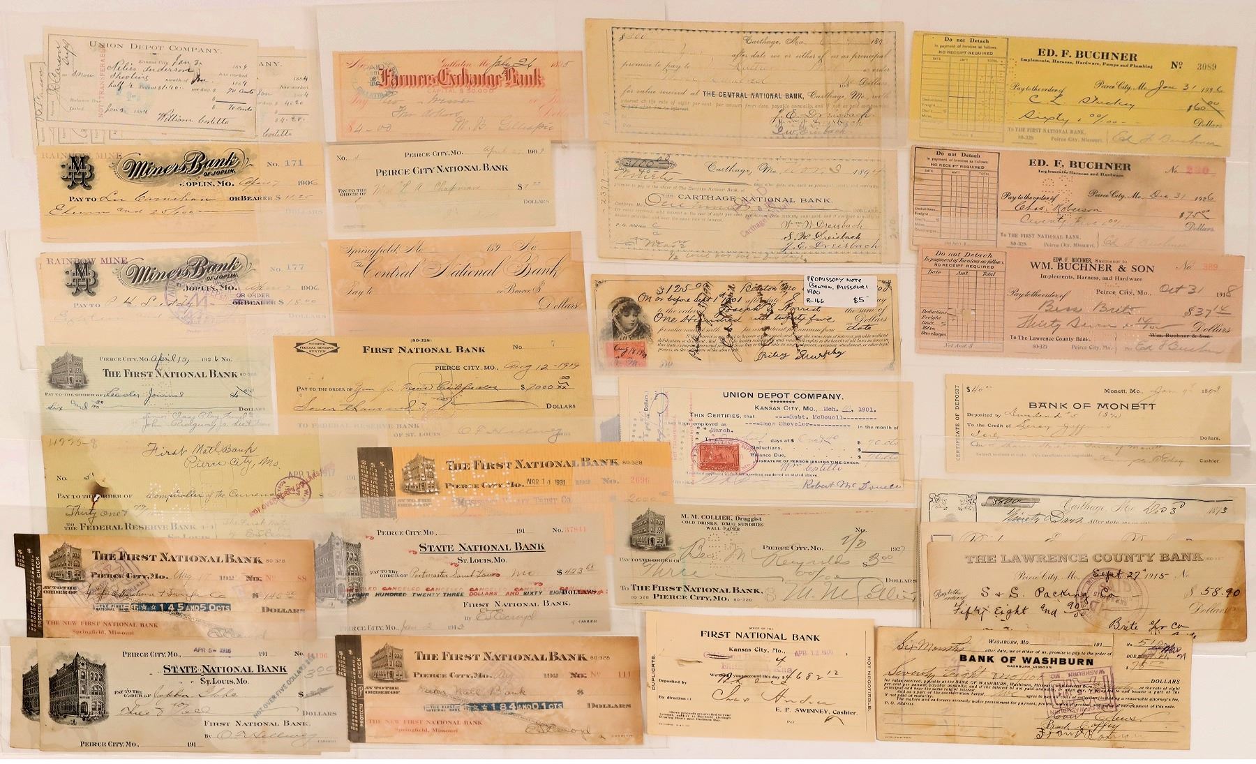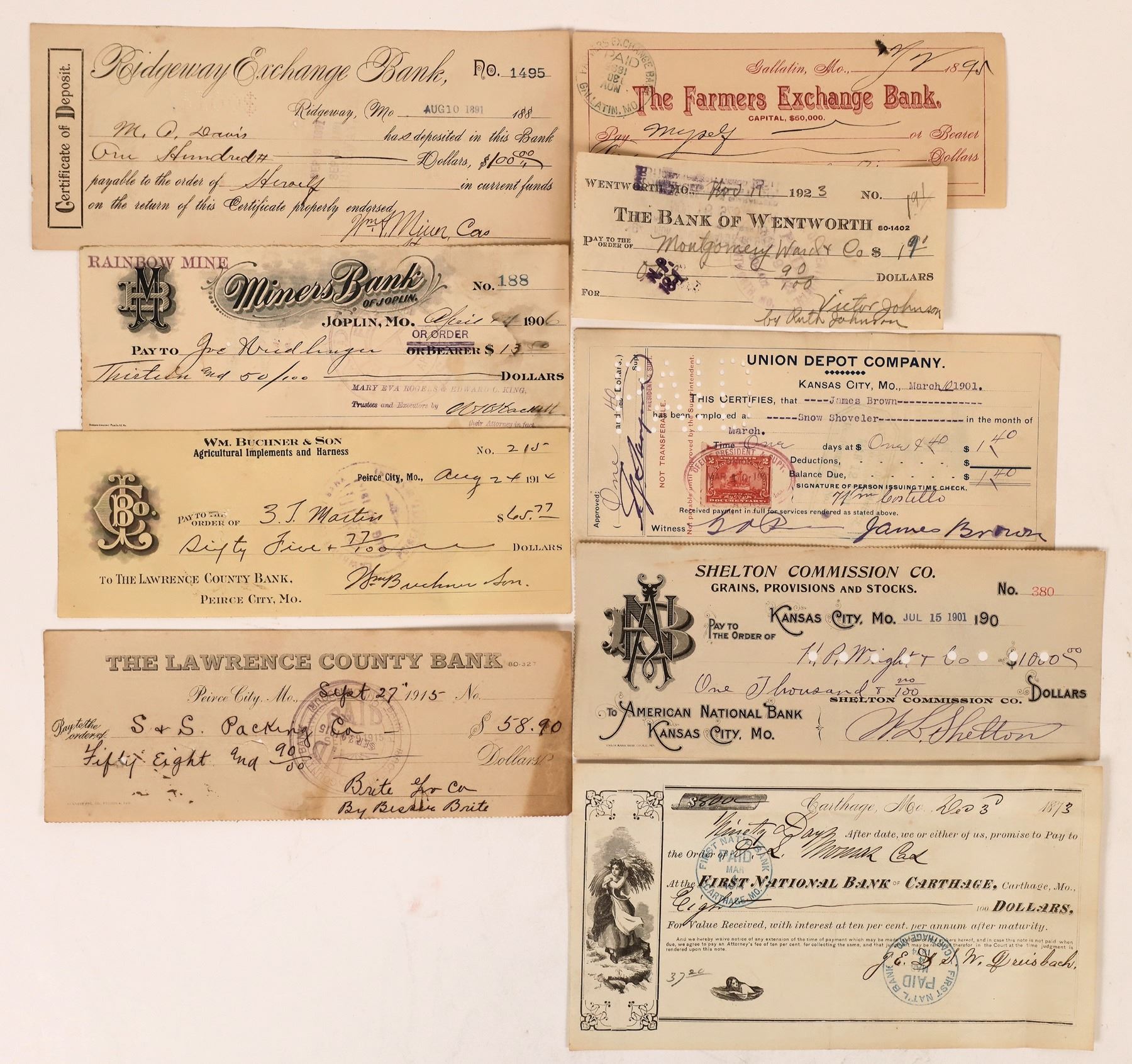 Lot of 40. Includes 7 Kansas City Union Depot, Bank of Monet, Large group of Peirce City, Kansas City Shelton Commission Company, Carthage First National Bank, Benton, Bank of Wentworth, Bank of Washburn, Springfield, Ridgeway Exchange Bank. Farmers Exchange Bank of Gallatin, 5 Miners Bank of Joplin,