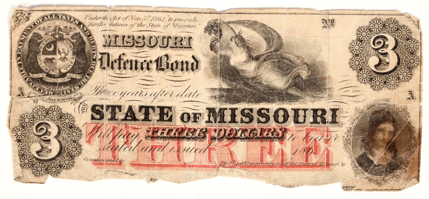 State of Missouri three dollar note. CR-17a. 1861. Ragged bottom.