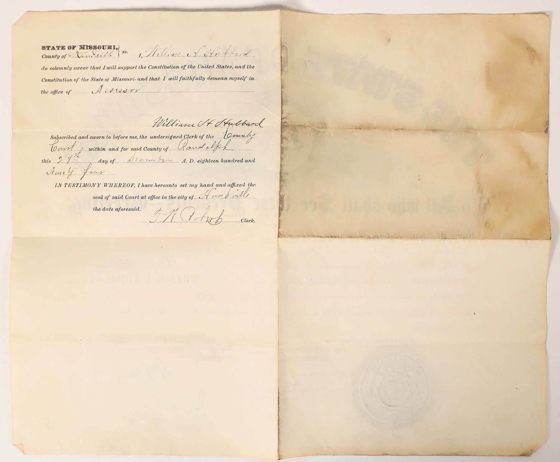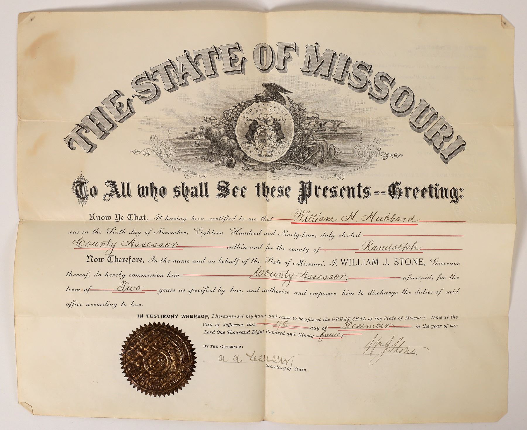 Governor William J. Stone, the 28th governor of the state of Missouri, signed this document confirming the election William H. Hubbard as Randolph County assessor. Please see photos for more details. Missouri 1894