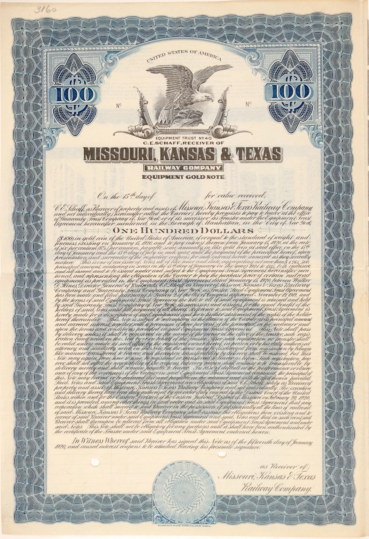 U/U, not numbered, Equipment Trust #40 note, 6% gold bearer bond. Dated Jan. 15,1920, C.E. Schaff receiver.. BLUE, vignette top eagle wings spread looking l-r, "GOLD" in blue underprint encased in sunburst circle. Coupons attached, Hamilton Bank Note Co printer. Cancel punch holes, but in EF condition. Not listed in Cox or other internet references. Ken Prag Collection