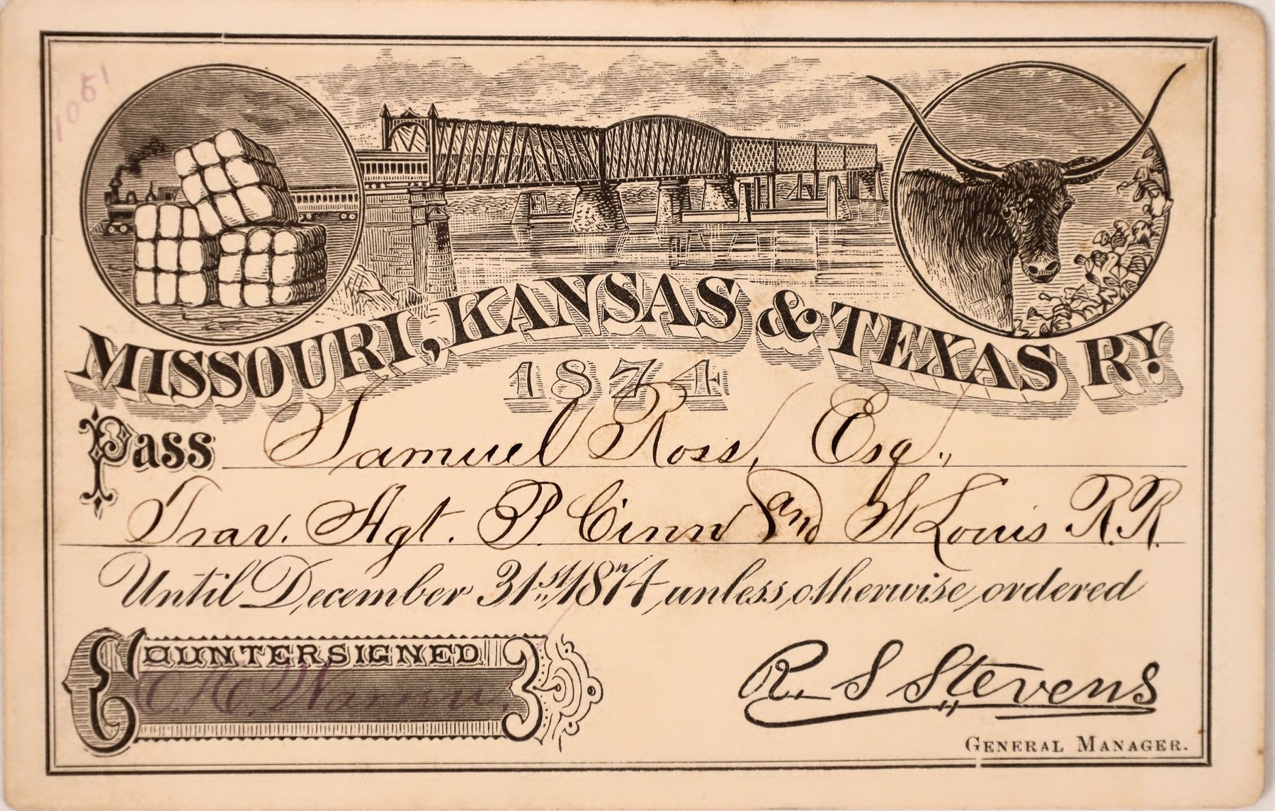 Great pictorial pass issued to Samuel Ross, Cincinnati & St. Luis Railroad. Preprinted signature of general manager RS Stevens. Countersigned by OH Warren. Three nice vignettes: bales of hay, railroad crossing bridge, and livestock. No printer listed. Created in 1865 as the Union Pacific Railway, Southern Branch, this company was an extensive rail network in Texas, Oklahoma, Kansas, and Missouri. In 1988, it merged with the Missouri Pacific Railroad and is now part of Union Pacific Railroad. Run by Jay Gould in 1880.