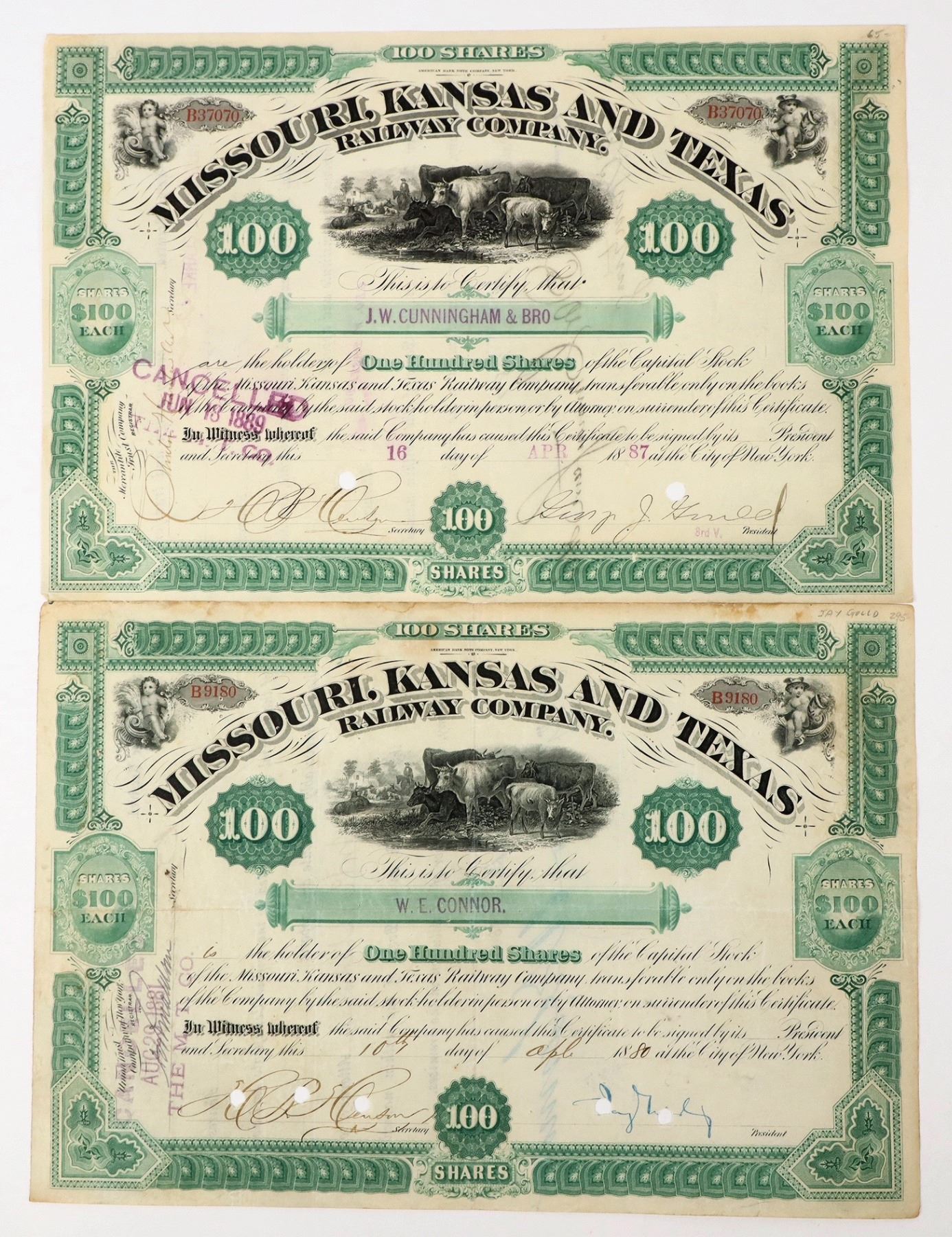 Lot of 2. Stock issued in 1880 and signed by Jay Gould as president. Stock issued in 1887 and signed by George J. Gould (his son) as third vice president. Both stocks punch cancelled which does affect signatures. Jay Gould (1836–1892) was an American railroad magnate and financier widely regarded as one of the most ruthless "robber barons" of the Gilded Age. He gained control of several major railroads, including the Union Pacific and the Erie Railroad, often using aggressive and controversial tactics such as stock manipulation and bribery. Despite public criticism, Gould amassed immense wealth and influence, leaving a legacy of both industrial expansion and ethical controversy in American business history.