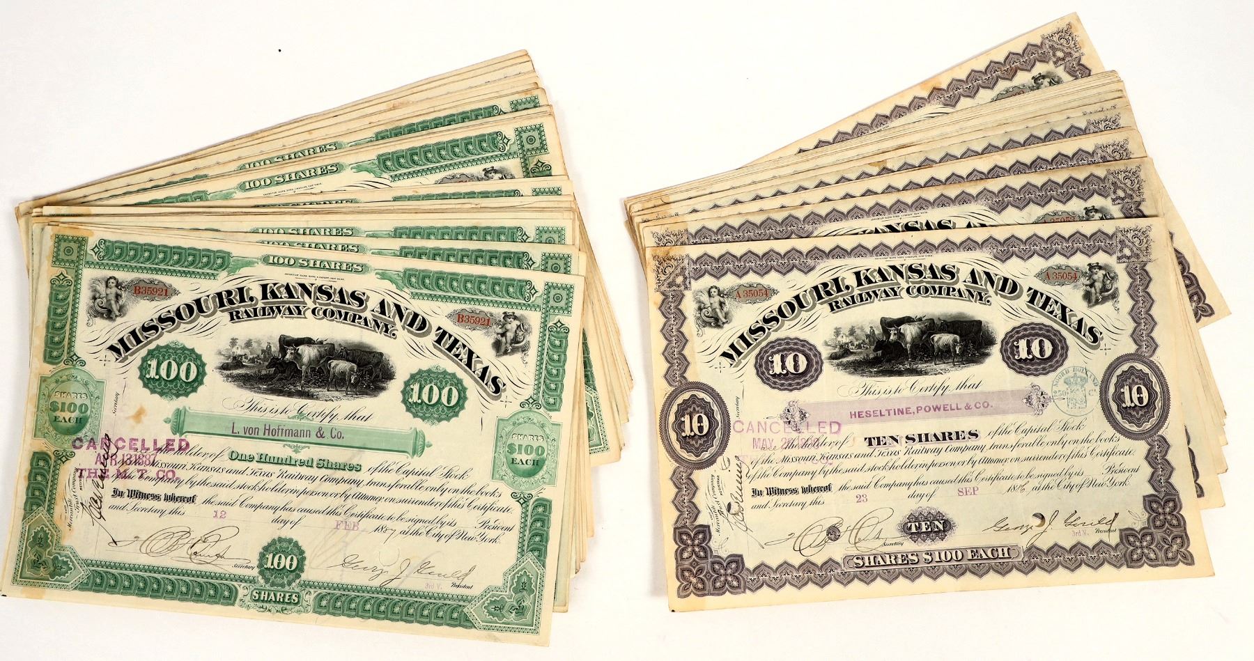 There are over 60 stock certificates signed by George J. Gould of the Missouri, Kansas and Texas Railroad Co. (1886). George Jay Gould was the son of the "railroad robber baron" Jay Gould noted for his unethical and (now) illegal business practices. Bribery and insider trading information were part of daily trade strategies at that time. It was reported that Jay Gould (the father) bribed President Grant's son-in-law to learn more about futures in the gold trade. He later controlled the Union Pacific Railroad in 1873.