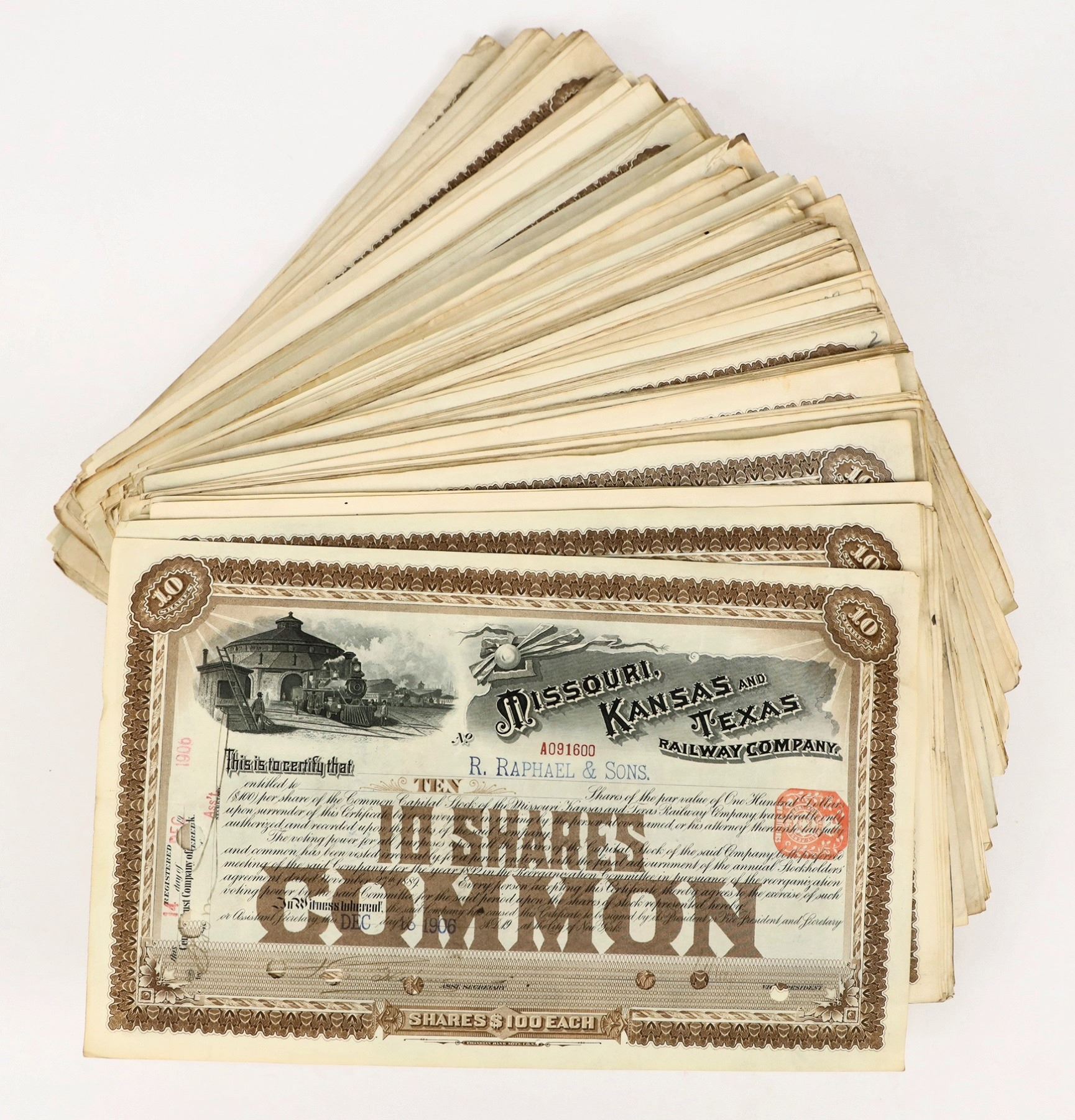 Missouri, Kansas and Texas Railroad Stocks. 500 +/- c.190x Issued, cancelled.