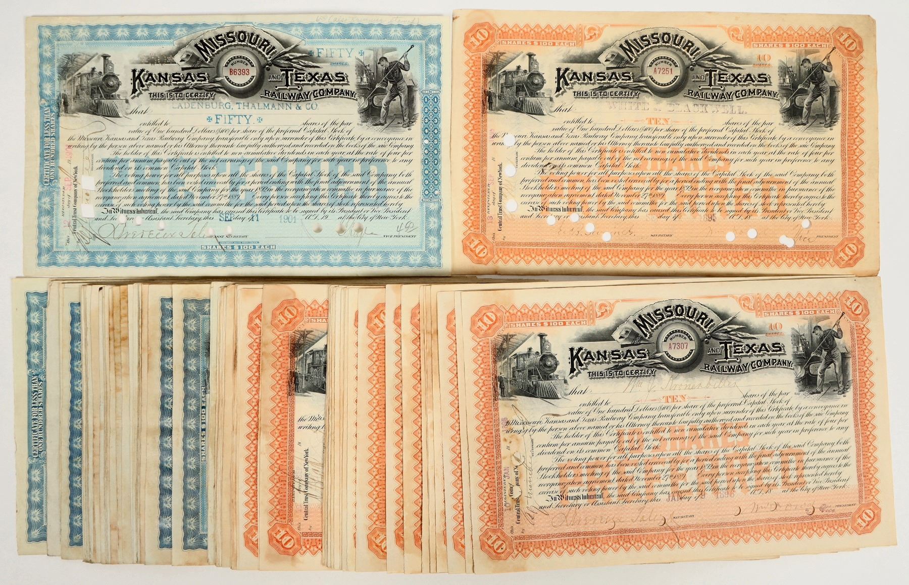 Over 125. I/U, I/C. Issued 1892-1901 VG or better.. Missouri, Kansas and Texas Railway Co, three varieties, some with imprinted revenue stamps. Franklin BNC printer.,