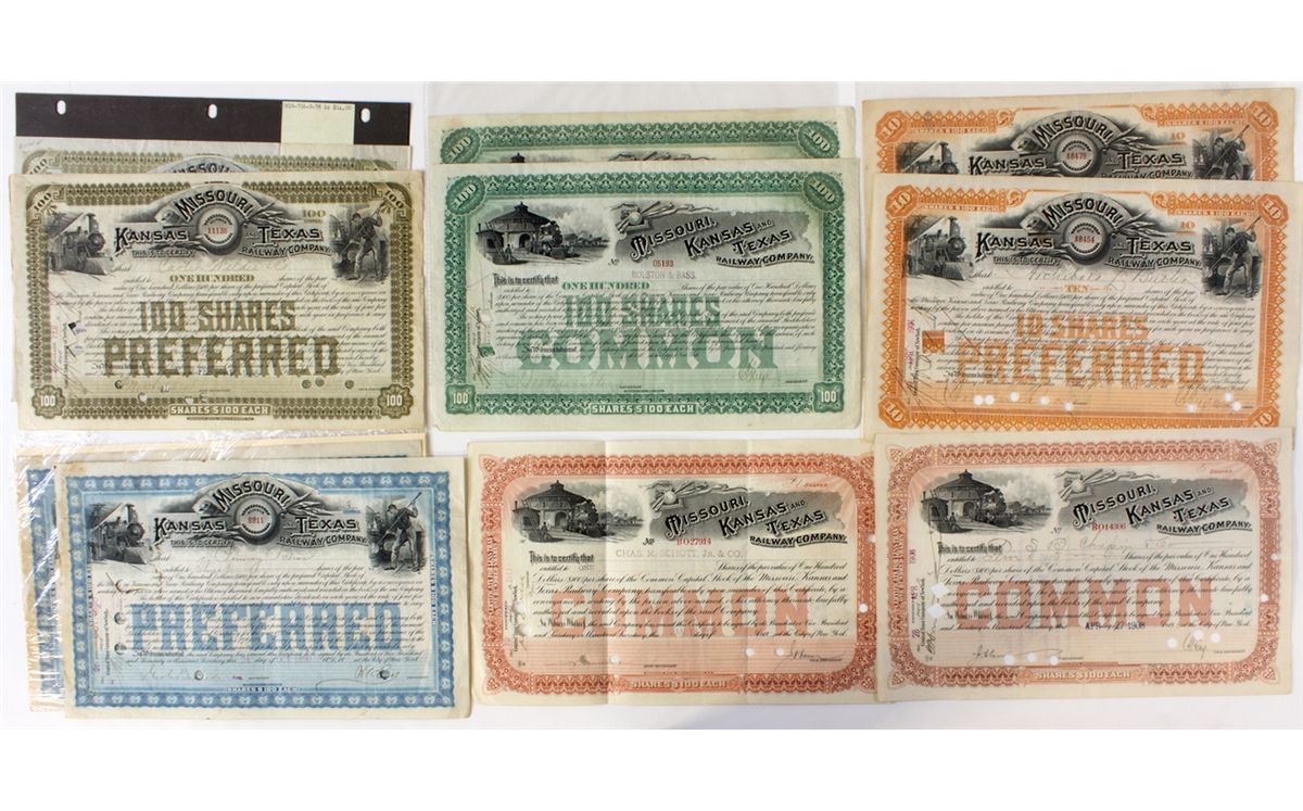 10 issued and cancelled stocks. All have vignettes. Two green (both 1897), two blue (both 1890), two red (1908 and 1916), two orange(both 1901), and two gold (1906 and 1909). A rainbow variety group! The Missouri, Kansas and Texas Railway (MTK) was the first railroad to enter Texas from the north. It was chartered in 1865 in Kansas by the Union Pacific RailwayÍs southern branch. After the Civil War, a resolution was passed in Congress to make sure the track made it to Texas, whose railroads didnÍt connect to other states at that time. The first train arrived in Texas (near Denison) on Christmas Day in 1872. Important 19th-century figures like J.P. Morgan and John D. Rockefeller were involved with the railroad. The company made history with a stunt that would never be approved of today. On September 15, 1896, the company purposefully collided two locomotives as a promotional event that was attended by 40,000 people. The promoters perhaps failed to anticipate what happened next: after the collision, the locomotive boilers exploded, sending hot shrapnel into the crown and resulting in 3 deaths and many injuries. [Ref: http://www.tshaonline.org/handbook/online/articles/llc01] Date , TX hwac 21037