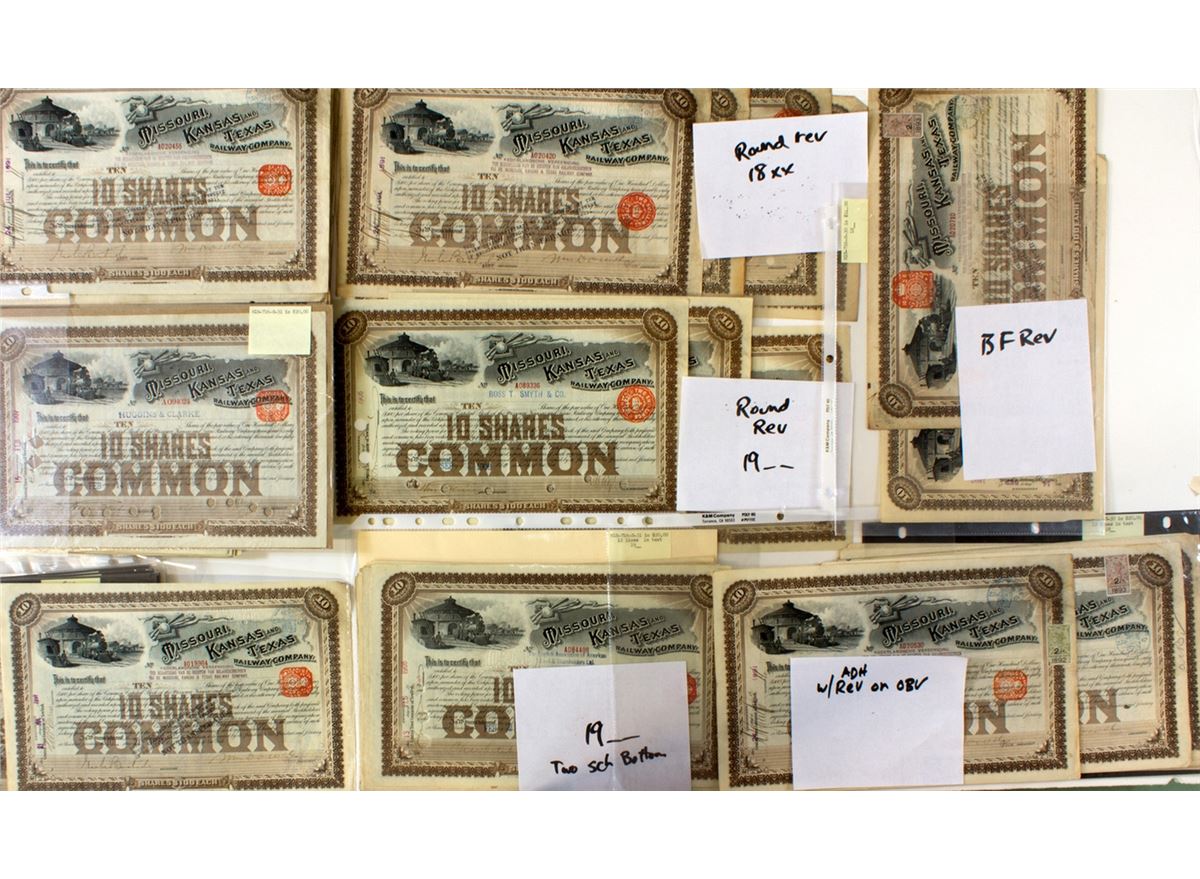 168 stocks, issued and cancelled, brown border, 10 shares. Vignette of locomotive leaving roundhouse. This variety group includes: 1) Round two shilling revenue imprint 18-- (6), 19-- (3). 2) Two Shilling top, 18-- (29), 19-- (63) 3) Two Shilling bottom, 18-- (24), 19-- (29). 4) Adhesive and orange revenue imprint (14). (MIS-716-S-30 ic and MIS-716-S-31 ic) The Missouri, Kansas and Texas Railway (MTK) was the first railroad to enter Texas from the north. It was chartered in 1865 in Kansas by the Union Pacific Railway’s southern branch. After the Civil War, a resolution was passed in Congress to make sure the track made it to Texas, whose railroads didn’t connect to other states at that time. The first train arrived in Texas (near Denison) on Christmas Day in 1872. Important 19th-century figures like J.P. Morgan and John D. Rockefeller were involved with the railroad. The company made history with a stunt that would never be approved of today. On September 15, 1896, the company purposefully collided two locomotives as a promotional event that was attended by 40,000 people. The promoters perhaps failed to anticipate what happened next: after the collision, the locomotive boilers exploded, sending hot shrapnel into the crown and resulting in 3 deaths and many injuries. [Ref: http://www.tshaonline.org/handbook/online/articles/llc01]