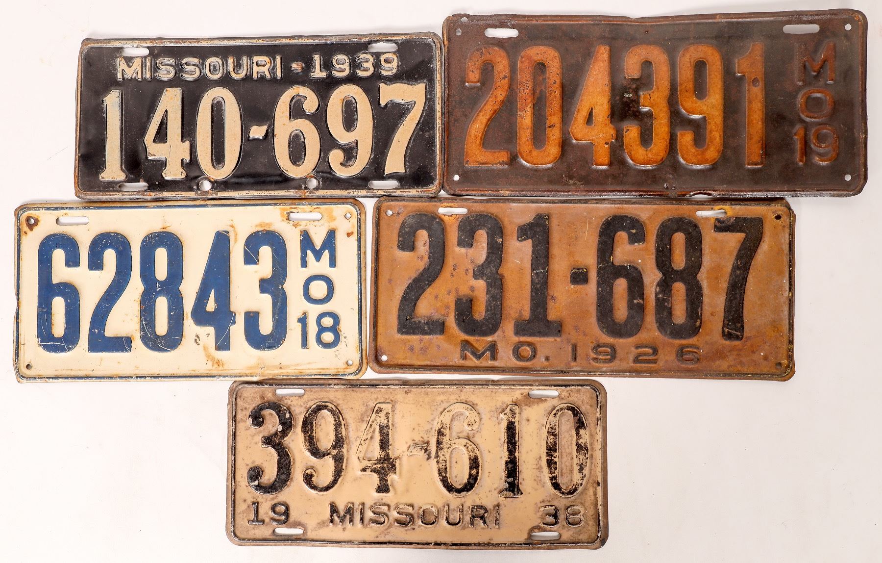 5 regular issue Missouri license plates, 1918-39. Condition varies, please inspect. Mississippi Bracken Estate