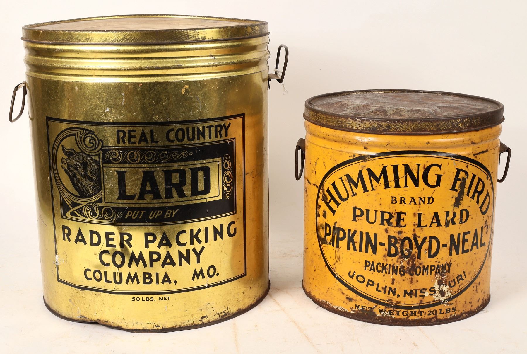Lard containers from the state of Missouri. First, we have a 50 pound capacity tin from Real Country Lard of Columbia, Mo. This container measures 13"x 14". There is also a 20 pound capacity tin of Humming Bird Brand from Joplin, Mo. This tin measures 10"x 10". Both have expected rust spots, but are in nice condition. Please see photos for more details. Joplin Missouri Gary Bracken Collection