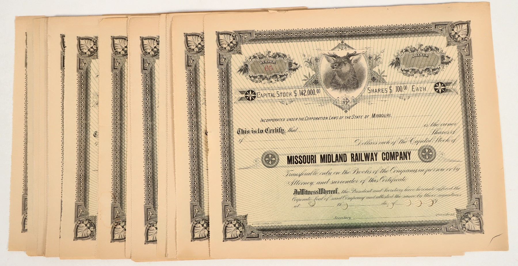 There are over 40 stock certificates for the Missouri Midland Railway Co. a Missouri centered rail-line. These stocks are unissued and unsigned however, they are perforated cancelled. There is little evidence that this rail line actually raised funds with publicly issued stocks. Please see photo for details.