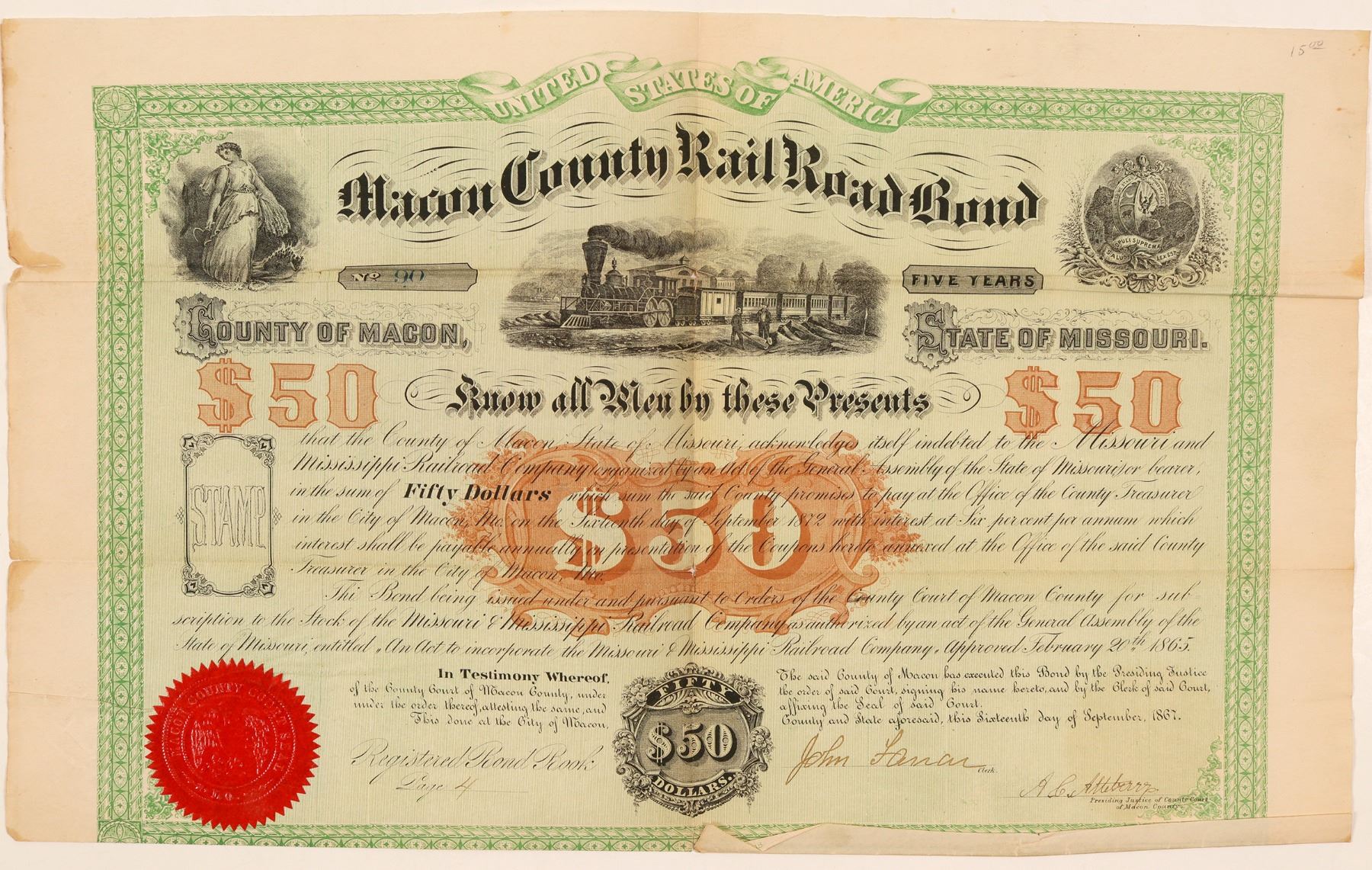 Macon County in aid to Missouri and Mississippi Railroad Co.. #90 , I/U, $50 6% 5 year bearer bond due 1872. Issued May 2. 1867, GREEN, embossed County seal, vignettes : top left allegorical female, center 4-4-0-train r-l , top right State seal. "$50" orange underprint, One coupon attached, A. Gast & Co. printer. Ken Prag Collection