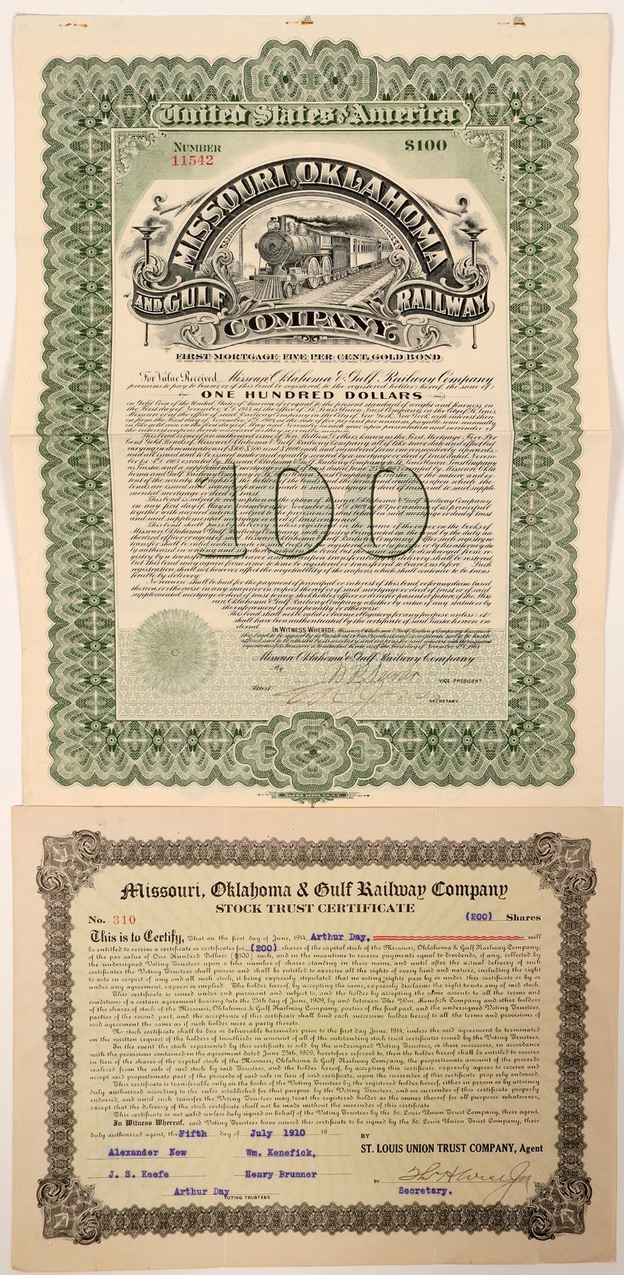 I/U, #310 Stock Trust Certificate for 200 shares @$100 par issued to Arthur Bay July 5, 1910 and signed Arthur Day Trustee, BLACK, no vignette, no printer named. Ken Prag Collection
