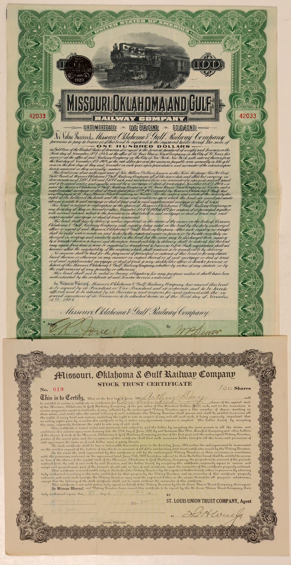 Two ephemera. Incorp Oct. 1904 Oklahoma. 1. #619, I/U, Stock Trust Certificate for 100 shares @ $100 par. Issued Jul 27, 1910 . BLACK, w/green underprint. No vignette. GOES printer. VF
