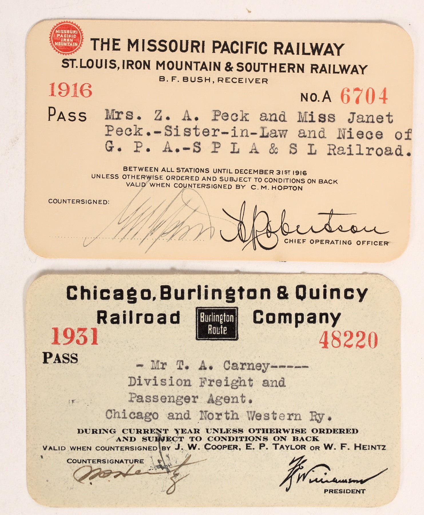 The Missouri Pacific Railway St. Louis, Iron Mountain & Southern Pacific Railway. Contains Missouri Pacific Iron Mountain logo. Chicago Burlington & Quincy Railroad Company, contains Burlington Route logo. Annual Passes, 1916, 1931. Chief Operating Officer printed signature, President printed signature. Vf/Vf