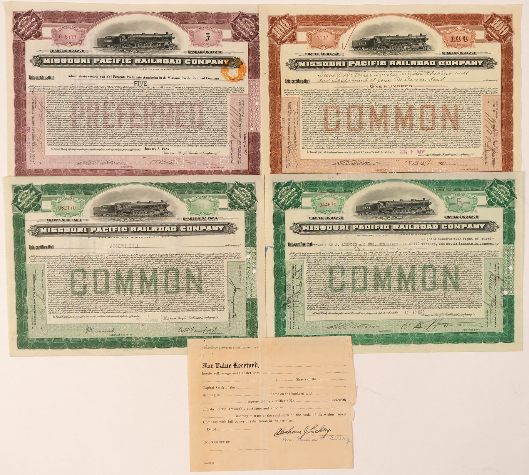 4 stock certificates. Two GREEN common stock less than 100 shares, and two ROSE one common and one preferred stock @ $100 par, and two ROSE one common and one preferred stock, vignettes of 4-6-2 loco #5308 l-r, "COMMON" green underprint, Security Bank Note Co . printer. #-44670 , I/U, 5 shares issued Mar 13, 1929 W/signed assignment certificate. #062170 , I/C, 25 shares issued Oct 31, 1933.