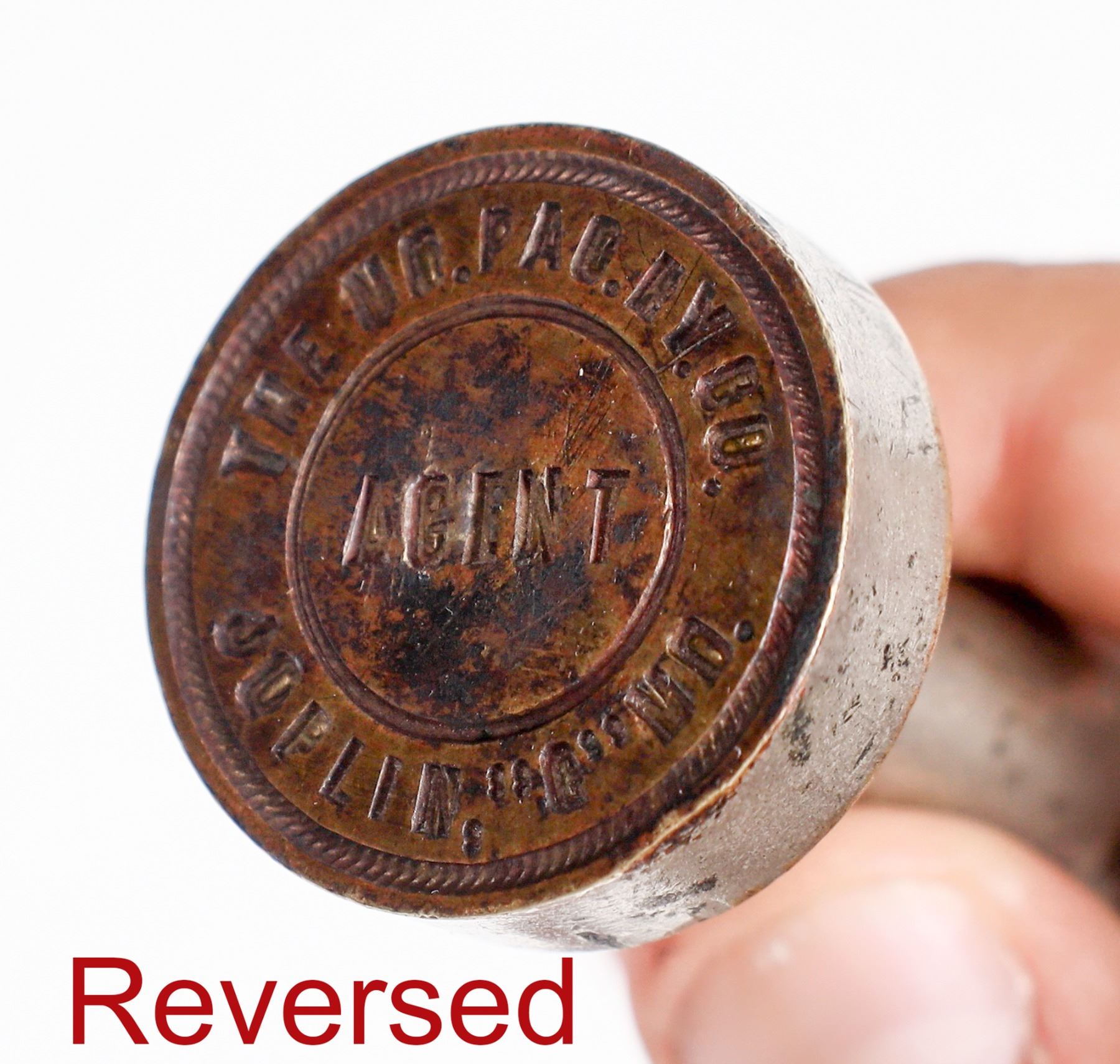 Wax sealer for an agent of the Missouri-Pacific Railroad Company. Would make the following imprint in the wax seal, "The Mo. Pac. Ry. Co./ Agent/ Joplin, "O" M.O. " 2.5 inches tall, 1 inch in diameter. Good condition.