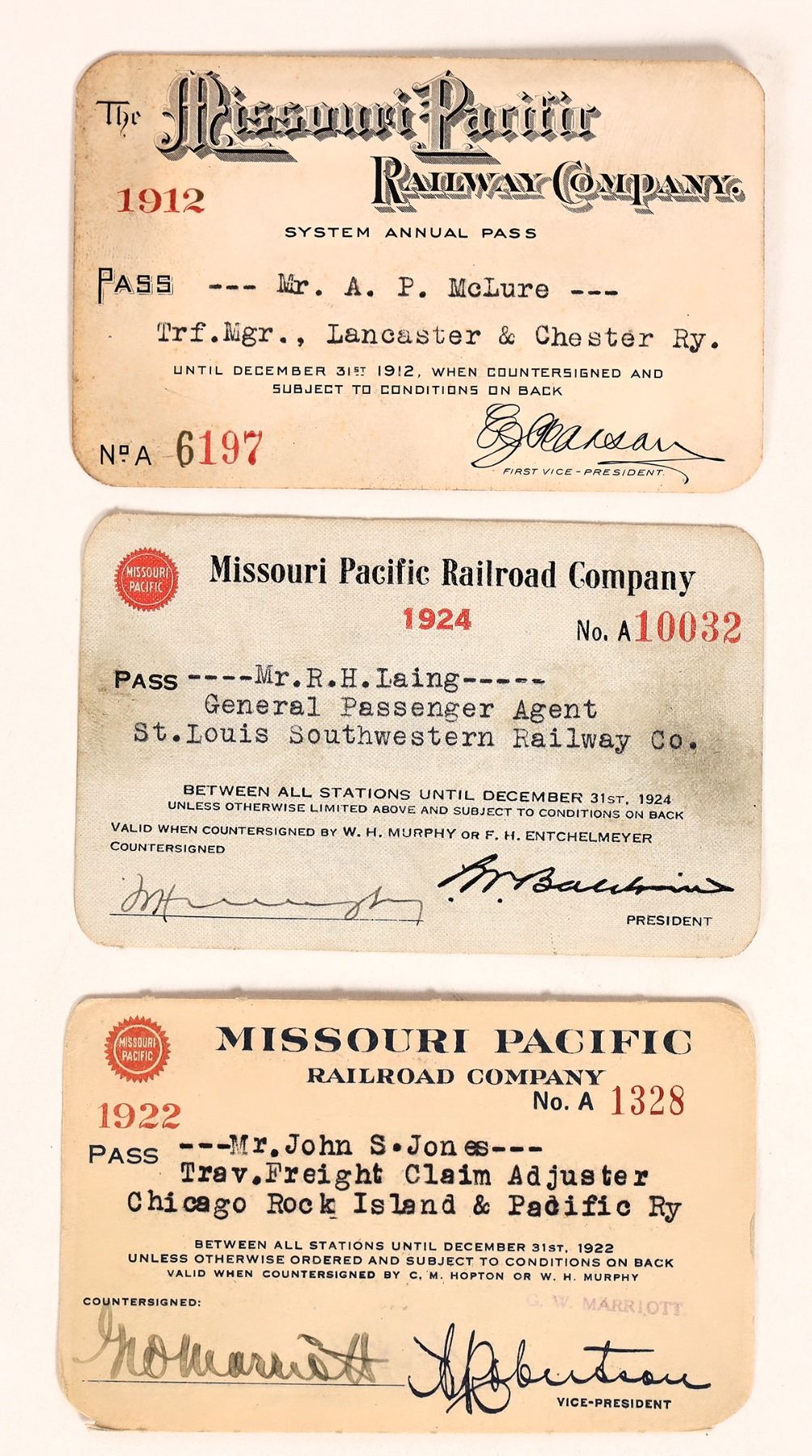(3) The Missouri Pacific Railway Company, Annual Passes, 1912, 1922, 1924. Issued to Mr. A. P. McLure, Mr. John S. Jones, Mr. R. H. Laing. Contains printed signatures of Vice President and President.