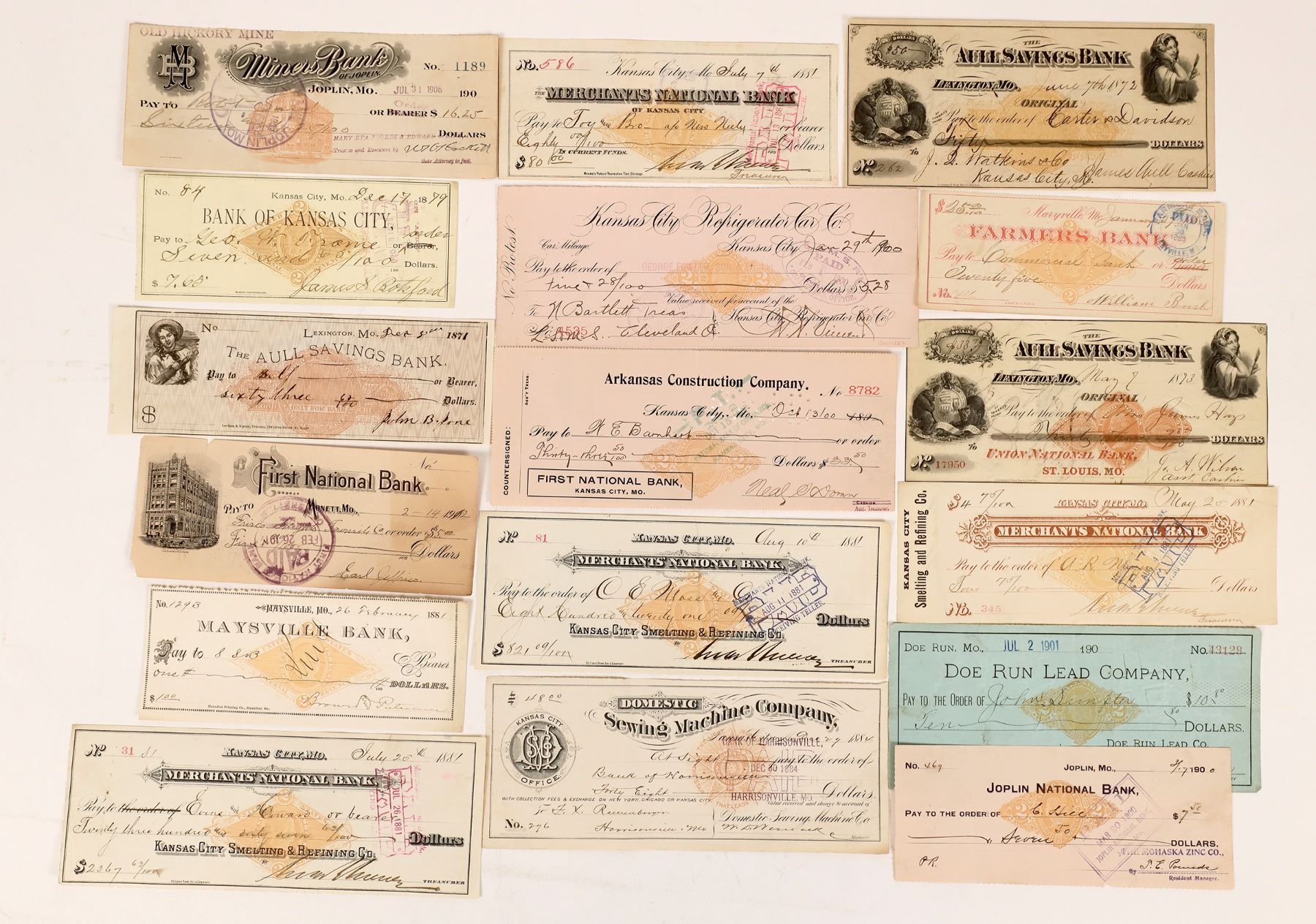 Lot of 17. Includes Joplin National Bank, Joplin Miners Bank, Doe Run Lead Company of Bonne Terre, Bank of Kansas City, Aull Savings Bank of Lexington, Kansas City Merchants National Bank, Arkansas Construction Co., Farmers Bank of Maryville, Maysville Bank, Monet First National Bank, etc. See Photo for more information.