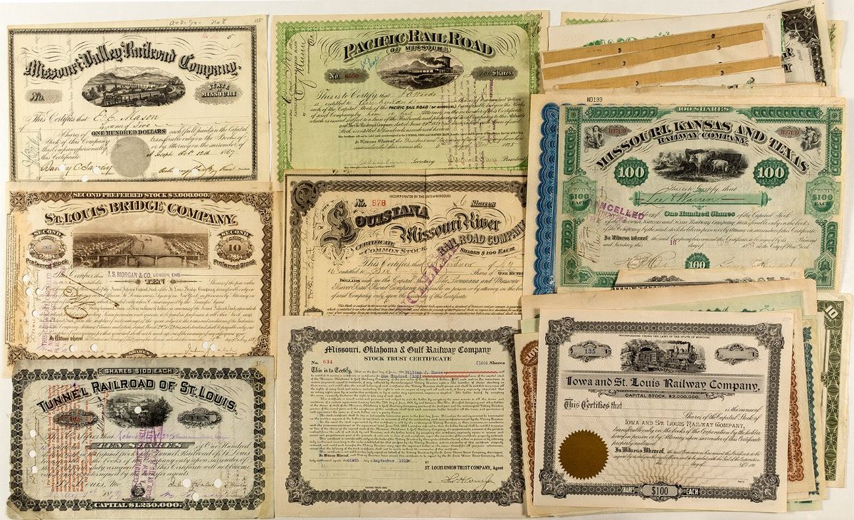 Lot of 32. Bonds: Gallatin County Railroad $1,000 bond issued 1870, punch cancelled, 8 coupons, tape repairs; St. Francois County Railroad Company, two $1,000 issued 1915, three $500 issued 1910 (punched w/ coupons), and one $100 issued 1910 (punched w/ coupons); $5,000 unissued bond for Toledo, St. Louis and Western Railroad (c.1900); and unissued $25 bond for Terminal Railroad Association of St. Louis. Stock certificates: Louisiana and Missouri River Railroad (1878, punch cancelled), Pacific Railroad of Missouri (1875, stamp cancelled), Tarkio Valley Railroad (1880, punch cancelled), Missouri, Kansas and Texas Railway (1887, punched), St. Louis Bridge Company (1887, punched), Tunnel Railroad of St. Louis (1879, punched), Missouri Valley Railroad (1867, punched), and others, including some unissued. Please inspect. Nice variety! Most pictorial. (Prag Collection) City: State: Missouri Date: hwac# 33967