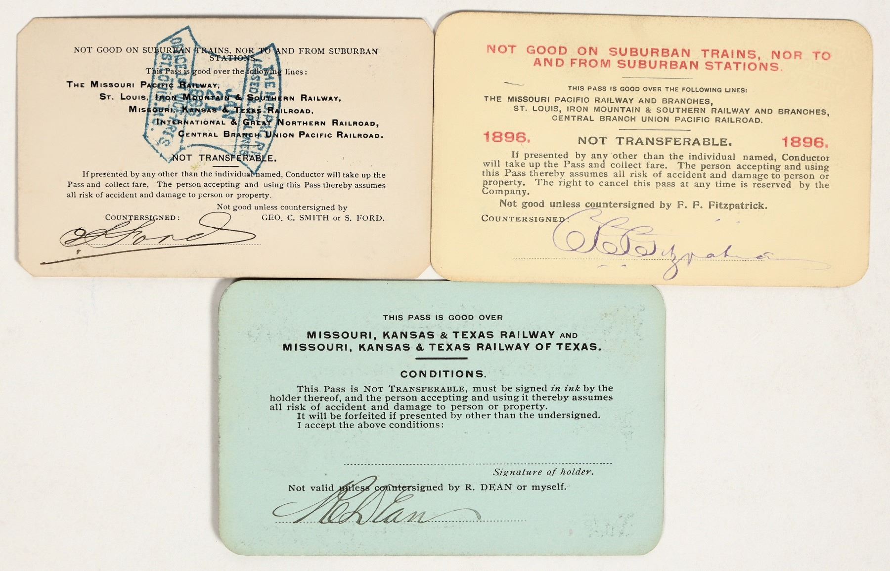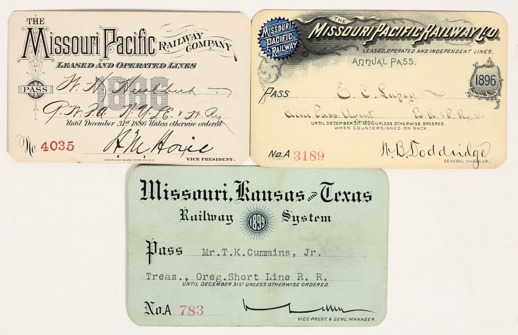 Lot of 3. All in excellent cond. No A783 Missouri, Kansas and Texas Railway System, issued 1899. No A3189 Missouri Pacific Railway System Annual pass, issued 1896, color logo upper left. No 4035 Missouri Pacific Railway Co. Issued 1886 printed in underprint.