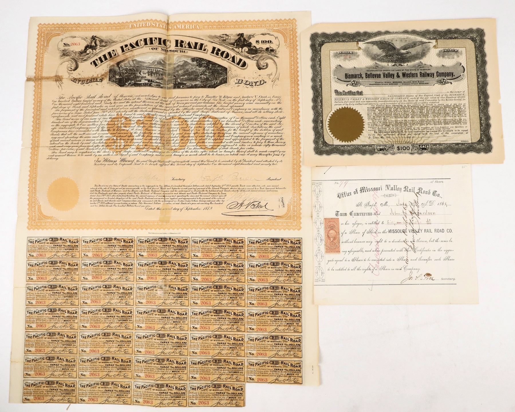 There are stocks for the Bismark, Belleveue Valley & Western Railway Co. gold trace sunburst 19xx unissued; Missouri Valley Rail Road Co, 1869; the Pacific Railroad of Missouri 1872. Please see photo for details.